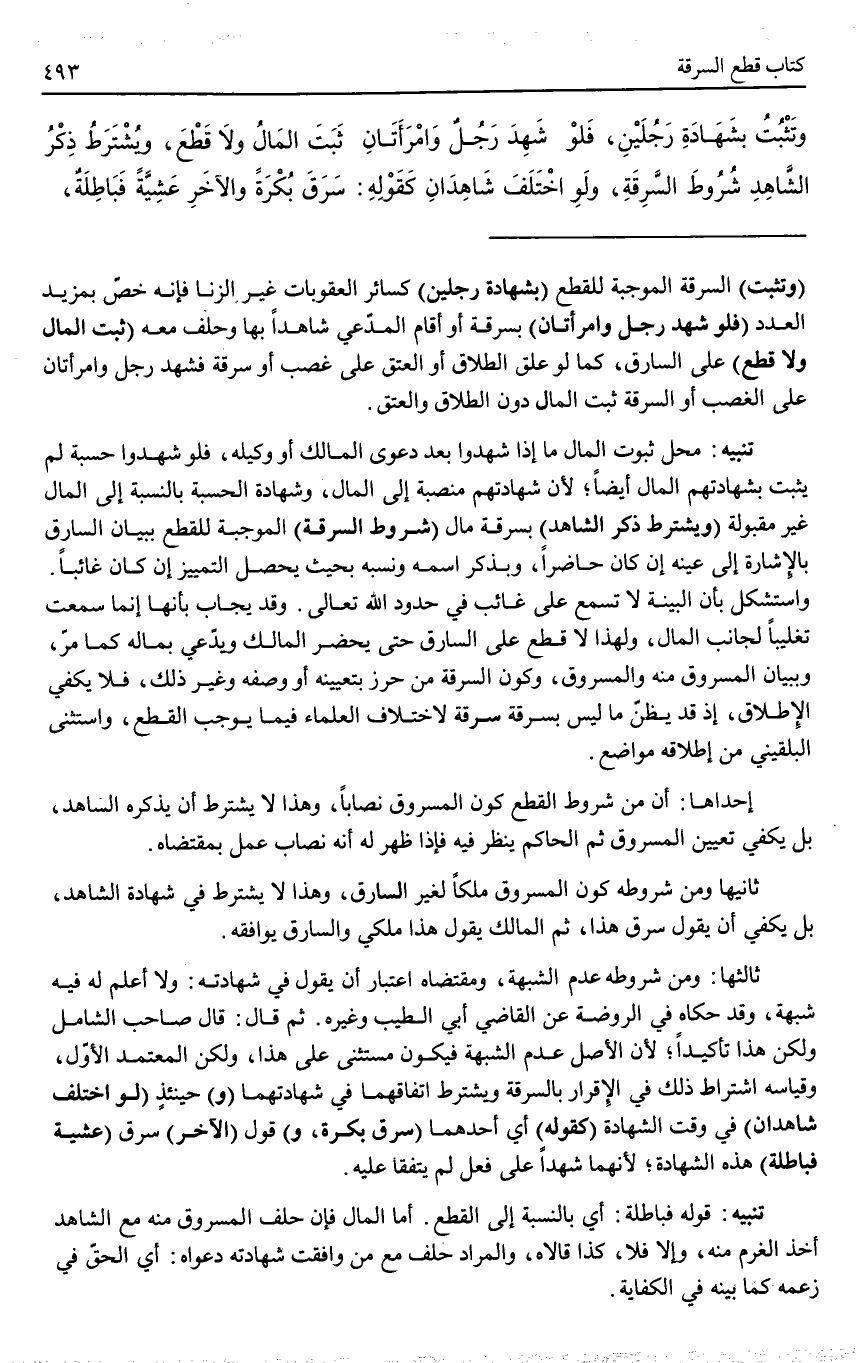 ـــــــــــــــــــــــــــــQ (وَتَثْبُتُ) السَّرِقَةُ الْمُوجِبَةُ لِلْقَطْعِ (بِشَهَادَةِ رَجُلَيْنِ) كَسَائِرِ الْعُقُوبَاتِ غَيْرِ الزِّنَا فَإِنَّهُ خُصَّ بِمَزِيدِ الْعَدَدِ (فَلَوْ شَهِدَ رَجُلٌ وَامْرَأَتَانِ) بِسَرِقَةٍ أَوْ أَقَامَ الْمُدَّعِي شَاهِدًا بِهَا وَحَلَفَ مَعَهُ (ثَبَتَ الْمَالُ وَلَا قَطْعَ) عَلَى السَّارِقِ، كَمَا لَوْ عَلَّقَ الطَّلَاقَ أَوْ الْعِتْقَ عَلَى غَصْبٍ أَوْ سَرِقَةٍ فَشَهِدَ رَجُلٌ وَامْرَأَتَانِ عَلَى الْغَصْبِ أَوْ السَّرِقَةِ ثَبَتَ الْمَالُ دُونَ الطَّلَاقِ وَالْعِتْقِ.