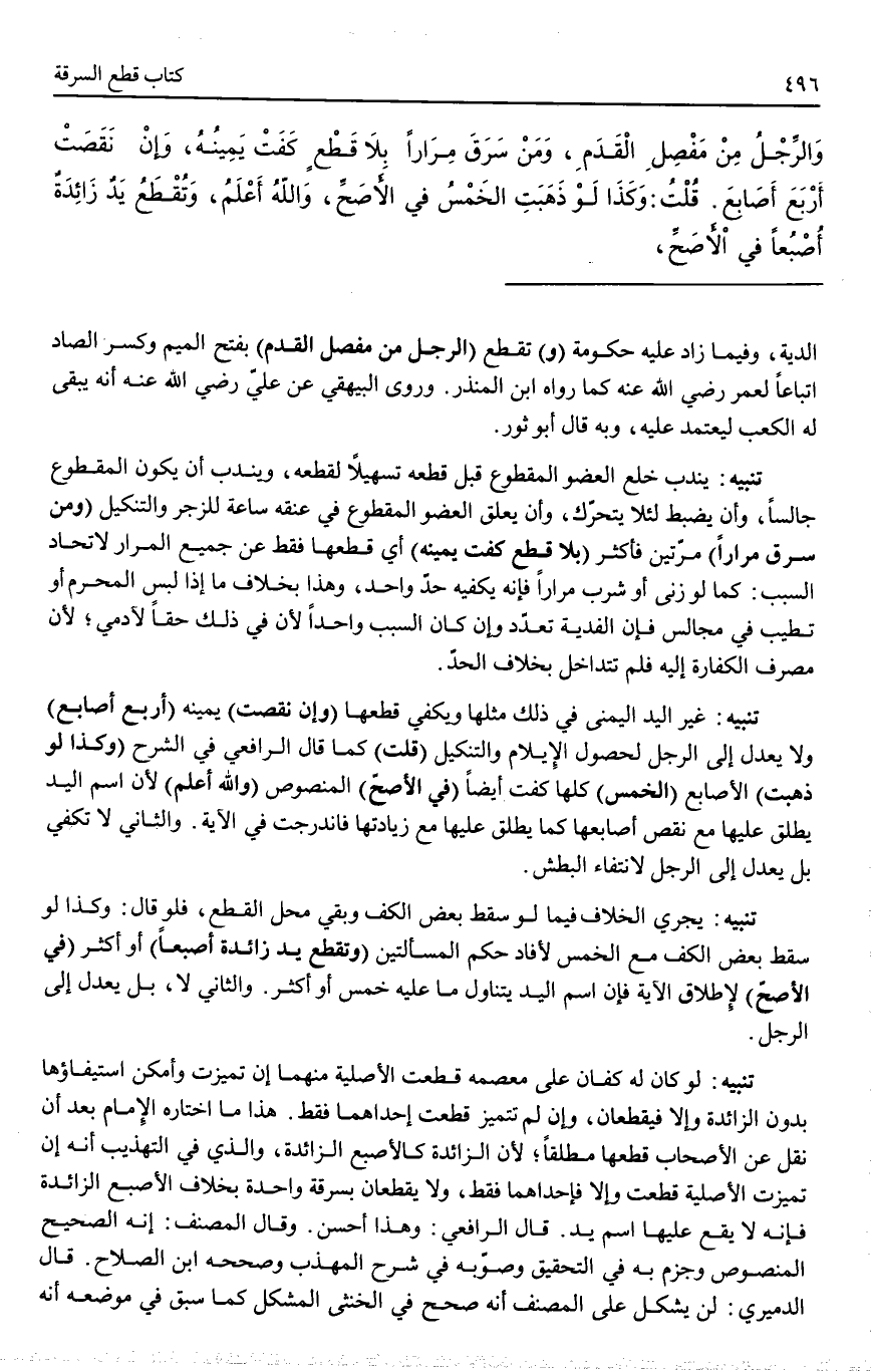 تَنْبِيهٌ بِمَا يَبْدَأُ فِي الْقَطْعِ غَيْرُ الْيَدِ الْيُمْنَى فِي ذَلِكَ مِثْلُهَا وَيَكْفِي قَطْعُهَا (وَإِنْ نَقَصَتْ) يَمِينُهُ (أَرْبَعَ أَصَابِعَ) وَلَا يَعْدِلُ إلَى الرِّجْلِ لِحُصُولِ الْإِيلَامِ وَالتَّنْكِيلِ (قُلْت) كَمَا قَالَ الرَّافِعِيُّ فِي الشَّرْحِ (وَكَذَا لَوْ ذَهَبَتْ) الْأَصَابِعُ (الْخَمْسُ) كُلُّهَا كَفَتْ أَيْضًا (فِي الْأَصَحِّ) الْمَنْصُوصِ (وَاَللَّهُ أَعْلَمُ) لِأَنَّ اسْمَ الْيَدِ يُطْلَقُ عَلَيْهَا مَعَ نَقْصِ أَصَابِعِهَا كَمَا يُطْلَقُ عَلَيْهَا مَعَ زِيَادَتِهَا فَانْدَرَجَتْ فِي الْآيَةِ. وَالثَّانِي لَا تَكْفِي بَلْ يَعْدِلُ إلَى الرِّجْلِ لِانْتِفَاءِ الْبَطْشِ.