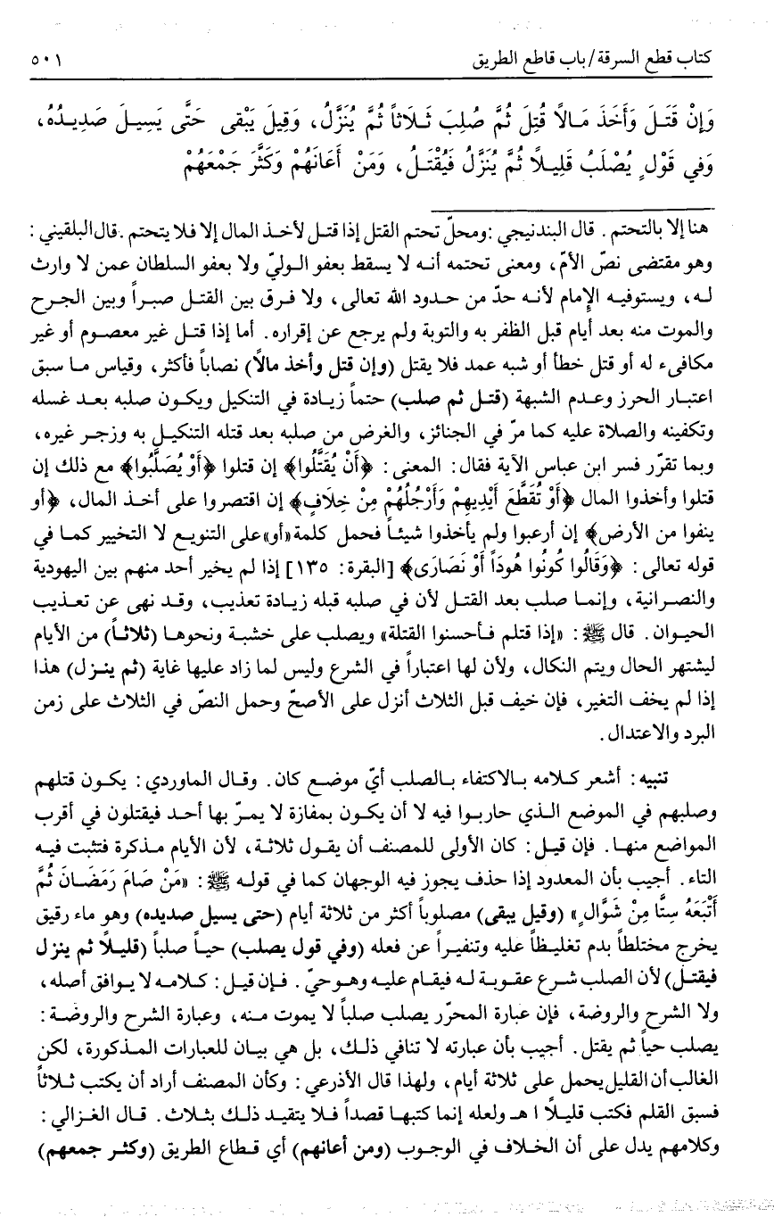 (وَإِنْ قَتَلَ وَأَخَذَ مَالًا) نِصَابًا فَأَكْثَرَ، وَقِيَاسُ مَا سَبَقَ اعْتِبَارُ الْحِرْزِ وَعَدَمُ الشُّبْهَةِ (قُتِلَ ثُمَّ صُلِبَ) حَتْمًا زِيَادَةً فِي التَّنْكِيلِ وَيَكُونُ صَلْبُهُ بَعْدَ غُسْلِهِ وَتَكْفِينِهِ وَالصَّلَاةِ عَلَيْهِ كَمَا مَرَّ فِي الْجَنَائِزِ، وَالْغَرَضُ مِنْ صَلْبِهِ بَعْدَ قَتْلِهِ التَّنْكِيلُ بِهِ وَزَجْرُ غَيْرِهِ، وَبِمَا تَقَرَّرَ فَسَّرَ ابْنُ عَبَّاسٍ الْآيَةَ فَقَالَ: الْمَعْنَى: {أَنْ يُقَتَّلُوا} [المائدة: 33] إنْ قَتَلُوا {أَوْ يُصَلَّبُوا} [المائدة: 33] مَعَ ذَلِكَ إنْ قَتَلُوا وَأَخَذُوا الْمَالَ {أَوْ تُقَطَّعَ أَيْدِيهِمْ وَأَرْجُلُهُمْ مِنْ خِلافٍ} [المائدة: 33] إنْ اقْتَصَرُوا عَلَى أَخْذِ الْمَالِ، {أَوْ يُنْفَوْا مِنَ الأَرْضِ} [المائدة: 33] إنْ أَرْعَبُوا وَلَمْ يَأْخُذُوا شَيْئًا فَحَمَلَ كَلِمَةَ " أَوْ " عَلَى التَّنْوِيعِ لَا التَّخْيِيرِ كَمَا فِي قَوْله تَعَالَى: " وَقَالُوا كُونُوا هُودًا أَوْ نَصَارَى " إذْ لَمْ يُخَيَّرْ أَحَدٌ مِنْهُمْ بَيْنَ الْيَهُودِيَّةِ وَالنَّصْرَانِيَّة، وَإِنَّمَا صُلِبَ بَعْدَ الْقَتْلِ؛ لِأَنَّ فِي صَلْبِهِ قَبْلَهُ زِيَادَةَ تَعْذِيبٍ، وَقَدْ نُهِيَ عَنْ تَعْذِيبِ الْحَيَوَانِ. قَالَ - صَلَّى اللَّهُ عَلَيْهِ وَسَلَّمَ -: «إذَا قَتَلْتُمْ فَأَحْسِنُوا الْقِتْلَةَ» وَيُصْلَبُ عَلَى خَشَبَةٍ وَنَحْوِهَا (ثَلَاثًا) مِنْ الْأَيَّامِ لِيَشْتَهِرَ الْحَالُ وَيَتِمَّ النَّكَالُ، وَلِأَنَّ لَهَا اعْتِبَارًا فِي الشَّرْعِ وَلَيْسَ لِمَا زَادَ عَلَيْهَا غَايَةٌ (ثُمَّ يُنَزَّلُ) هَذَا إذَا لَمْ يُخَفْ التَّغَيُّرُ، فَإِنْ خِيفَ قَبْلَ الثَّلَاثِ أُنْزِلَ عَلَى الْأَصَحِّ وَحُمِلَ النَّصُّ فِي الثَّلَاثِ عَلَى زَمَنِ الْبَرْدِ وَالِاعْتِدَالِ.