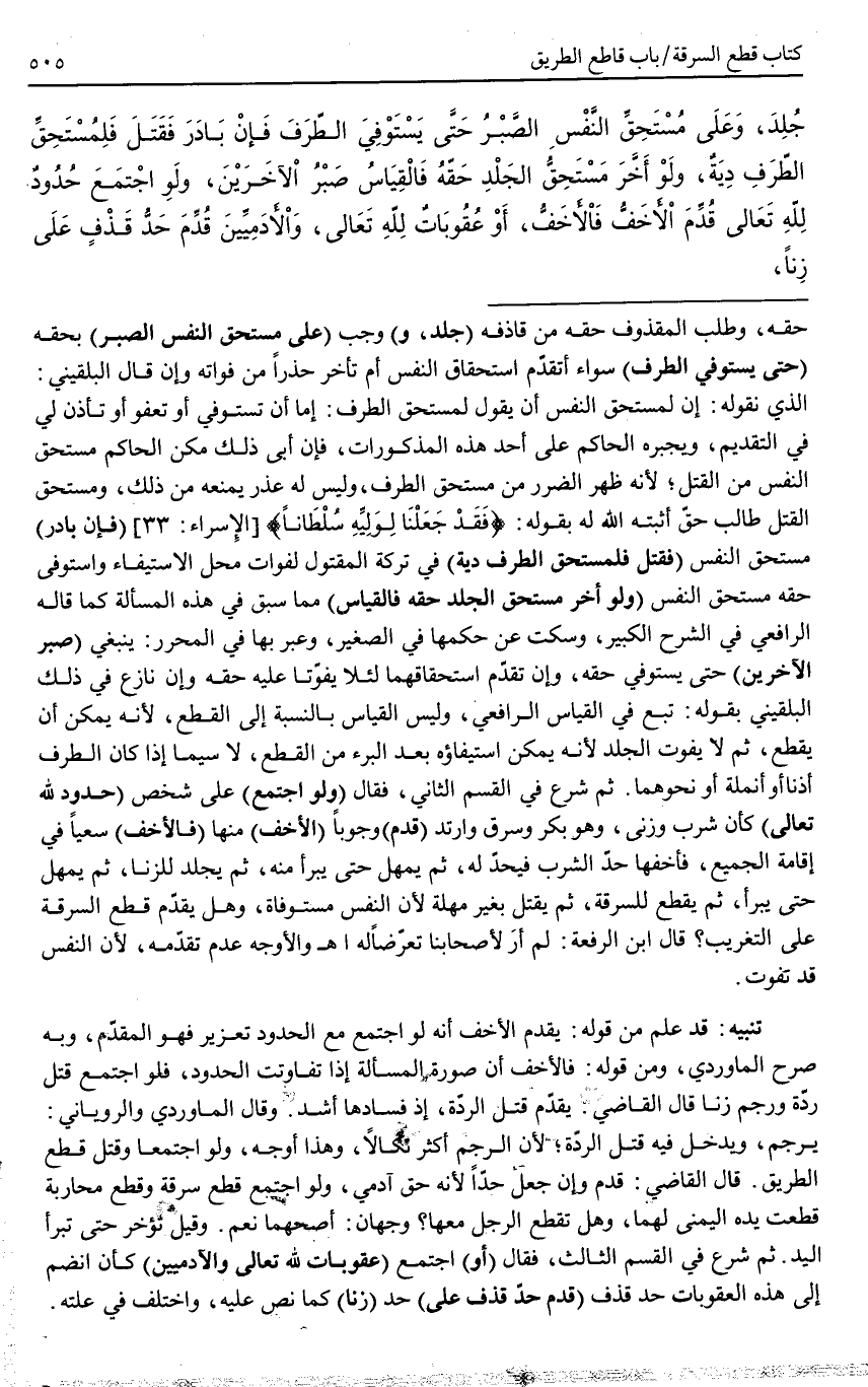ثُمَّ شَرَعَ فِي الْقِسْمِ الثَّانِي، فَقَالَ (وَلَوْ اجْتَمَعَ) عَلَى شَخْصٍ (حُدُودٌ لِلَّهِ تَعَالَى) كَأَنْ شَرِبَ وَزَنَى، وَهُوَ بِكْرٌ وَسَرَقَ وَارْتَدَّ (قُدِّمَ) وُجُوبًا (الْأَخَفُّ) مِنْهَا (فَالْأَخَفُّ) سَعْيًا فِي إقَامَةِ الْجَمِيعِ، فَأَخَفُّهَا حَدُّ الشُّرْبِ فَيُحَدُّ لَهُ، ثُمَّ يُمْهَلُ حَتَّى يَبْرَأَ مِنْهُ، ثُمَّ يُجْلَدُ لِلزِّنَا، ثُمَّ يُمْهَلُ حَتَّى يَبْرَأَ، ثُمَّ يُقْطَعُ لِلسَّرِقَةِ، ثُمَّ يُقْتَلُ بِغَيْرِ مُهْلَةٍ؛ لِأَنَّ النَّفْسَ مُسْتَوْفَاةٌ، وَهَلْ يُقَدَّمُ قَطْعُ السَّرِقَةِ عَلَى التَّغْرِيبِ؟ قَالَ ابْنُ الرِّفْعَةِ: لَمْ أَرَ لِأَصْحَابِنَا تَعَرُّضًا لَهُ. وَالْأَوْجَهُ عَدَمُ تَقَدُّمِهِ، لِأَنَّ النَّفْسَ قَدْ تَفُوتُ.