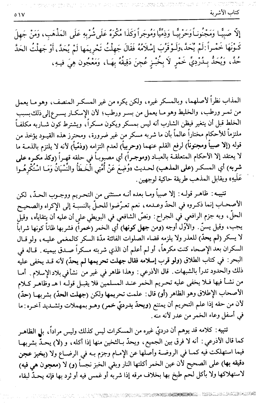 (وَمَنْ جَهِلَ كَوْنَهَا) أَيْ الْخَمْرِ (خَمْرًا) فَشَرِبَهَا ظَانًّا كَوْنَهَا شَرَابًا لَا يُسْكِرُ (لَمْ يُحَدَّ) لِلْعُذْرِ وَلَا يَلْزَمُهُ قَضَاءُ الصَّلَوَاتِ الْفَائِتَةِ مُدَّةِ السُّكْرِ كَالْمُغْمَى عَلَيْهِ، وَلَوْ قَالَ السَّكْرَانُ بَعْدَ الْإِصْحَاءِ كُنْتُ مُكْرَهًا، أَوْ لَمْ أَعْلَمْ أَنَّ الَّذِي شَرِبْتُهُ مُسْكِرًا صُدِّقَ بِيَمِينِهِ. قَالَهُ فِي الْبَحْرِ: فِي كِتَابِ الطَّلَاقِ (وَلَوْ قَرُبَ إسْلَامُهُ فَقَالَ جَهِلْتُ تَحْرِيمَهَا لَمْ يُحَدَّ) لِأَنَّهُ قَدْ يَخْفَى عَلَيْهِ ذَلِكَ وَالْحُدُودُ تُدْرَأُ بِالشُّبُهَاتِ. قَالَ الْأَذْرَعِيُّ: وَهَذَا ظَاهِرٌ فِي غَيْرِ مَنْ نَشَأَ فِي بِلَادِ الْإِسْلَامِ. أَمَّا مَنْ نَشَأَ فِيهَا فَلَا يَخْفَى عَلَيْهِ تَحْرِيمُ الْخَمْرِ عِنْدَ الْمُسْلِمِينَ فَلَا يُقْبَلُ قَوْلُهُ اهـ.
