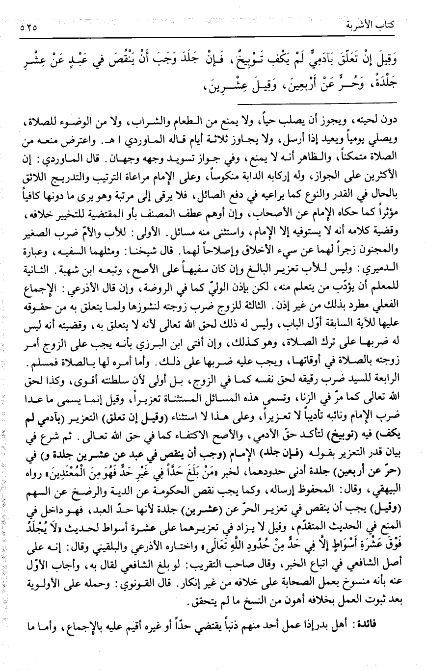 الْأُولَى: لِلْأَبِ وَالْأُمِّ ضَرْبُ الصَّغِيرِ وَالْمَجْنُونِ زَجْرًا لَهُمَا عَنْ سَيِّئِ الْأَخْلَاقِ وَإِصْلَاحًا لَهُمَا. قَالَ شَيْخُنَا: وَمِثْلُهُمَا السَّفِيهُ، وَعِبَارَةُ الدَّمِيرِيِّ: وَلَيْسَ لِلْأَبِ تَعْزِيرُ الْبَالِغِ وَإِنْ كَانَ سَفِيهًا عَلَى الْأَصَحِّ، وَتَبِعَهُ ابْنُ شُهْبَةَ. الثَّانِيَة لِلْمُعَلِّمِ أَنْ يُؤَدِّبَ مَنْ يَتَعَلَّمُ مِنْهُ، لَكِنْ بِإِذْنِ الْوَلِيِّ كَمَا فِي الرَّوْضَةِ، وَإِنْ قَالَ الْأَذْرَعِيُّ: الْإِجْمَاعُ الْفِعْلِيُّ مُطَّرِدٌ بِذَلِكَ مِنْ غَيْرِ إذْنٍ. الثَّالِثَةُ لِلزَّوْجِ ضَرْبُ زَوْجَتِهِ لِنُشُوزِهَا وَلِمَا يَتَعَلَّقُ بِهِ مِنْ حُقُوقِهِ عَلَيْهَا لِلْآيَةِ السَّابِقَةِ أَوَّلَ الْبَابِ، وَلَيْسَ لَهُ ذَلِكَ لِحَقِّ اللَّهِ تَعَالَى لِأَنَّهُ لَا يَتَعَلَّقُ بِهِ، وَقَضِيَّتُهُ أَنَّهُ لَيْسَ لَهُ ضَرْبُهَا عَلَى تَرْكِ الصَّلَاةِ، وَهُوَ كَذَلِكَ، وَإِنْ أَفْتَى ابْنُ الْبَرَزِيِّ بِأَنَّهُ يَجِبُ عَلَى الزَّوْجِ أَمْرُ زَوْجَتِهِ بِالصَّلَاةِ فِي أَوْقَاتِهَا، وَيَجِبُ عَلَيْهِ ضَرْبُهَا عَلَى ذَلِكَ. وَأَمَّا أَمْرُهُ لَهَا بِالصَّلَاةِ فَمُسَلَّمٌ.