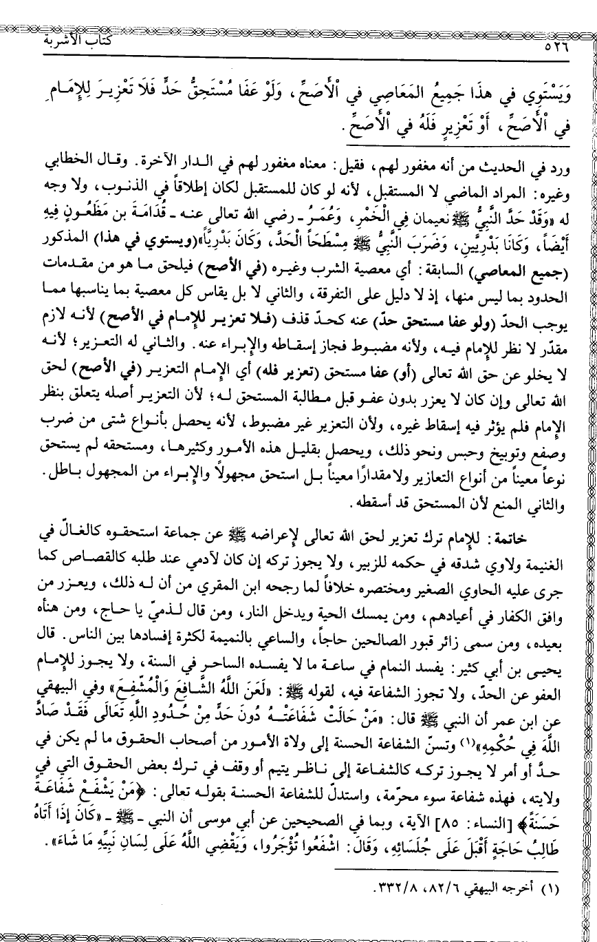 خَاتِمَةٌ: لِلْإِمَامِ تَرْكُ تَعْزِيرٍ لِحَقِّ اللَّهِ تَعَالَى لِإِعْرَاضِهِ - صَلَّى اللَّهُ عَلَيْهِ وَسَلَّمَ - عَنْ جَمَاعَةٍ اسْتَحَقُّوهُ كَالْغَالِّ فِي الْغَنِيمَةِ وَلَاوِي شِدْقَهُ فِي حُكْمِهِ لِلزُّبَيْرِ، وَلَا يَجُوزُ تَرْكُهُ إنْ كَانَ لِآدَمِيٍّ عِنْدَ طَلَبِهِ كَالْقِصَاصِ كَمَا جَرَى عَلَيْهِ الْحَاوِي الصَّغِيرُ وَمُخْتَصَرُهُ خِلَافًا لِمَا رَجَّحَهُ ابْنُ الْمُقْرِي مِنْ أَنَّ لَهُ ذَلِكَ، وَيُعَزَّرُ مَنْ وَافَقَ الْكُفَّارَ فِي أَعْيَادِهِمْ، وَمَنْ يُمْسِكُ الْحَيَّةَ وَيَدْخُلُ النَّارَ، وَمَنْ قَالَ لِذِمِّيٍّ يَا حَاجُّ، وَمَنْ هَنَّأَهُ بِعِيدِهِ، وَمَنْ سَمَّى زَائِرَ قُبُورِ الصَّالِحِينَ حَاجًّا، وَالسَّاعِي بِالنَّمِيمَةِ لِكَثْرَةِ إفْسَادِهَا بَيْنَ النَّاسِ. قَالَ يَحْيَى بْنُ أَبِي كَثِيرٍ: يُفْسِدُ النَّمَّامُ فِي سَاعَةٍ مَا لَا يُفْسِدُهُ السَّاحِرُ فِي السَّنَةِ، وَلَا يَجُوزُ لِلْإِمَامِ الْعَفْوُ عَنْ الْحَدِّ، وَلَا تَجُوزُ الشَّفَاعَةُ فِيهِ، لِقَوْلِهِ - صَلَّى اللَّهُ عَلَيْهِ وَسَلَّمَ -: «لَعَنَ اللَّهُ الشَّافِعَ وَالْمُشَفِّعَ» وَفِي الْبَيْهَقِيّ عَنْ ابْنِ عُمَرَ أَنَّ النَّبِيَّ - صَلَّى اللَّهُ عَلَيْهِ وَسَلَّمَ - قَالَ: «مَنْ حَالَتْ شَفَاعَتُهُ دُونَ حَدٍّ مِنْ حُدُودِ اللَّهِ تَعَالَى فَقَدْ صَادَّ اللَّهَ فِي حُكْمِهِ» وَتُسَنُّ الشَّفَاعَةُ الْحَسَنَةُ إلَى وُلَاةِ الْأُمُورِ مِنْ أَصْحَابِ الْحُقُوقِ مَا لَمْ يَكُنْ فِي حَدٍّ أَوْ أَمْرٍ لَا يَجُوزُ تَرْكُهُ كَالشَّفَاعَةِ إلَى نَاظِرِ يَتِيمٍ أَوْ وَقْفٍ فِي تَرْكِ بَعْضِ الْحُقُوقِ الَّتِي فِي وِلَايَتِهِ، فَهَذِهِ شَفَاعَةُ سُوءٍ مُحَرَّمَةٌ، وَاسْتُدِلَّ لِلشَّفَاعَةِ الْحَسَنَةِ بِقَوْلِهِ تَعَالَى: {مَنْ يَشْفَعْ شَفَاعَةً حَسَنَةً} [النساء: 85] الْآيَةَ، وَبِمَا فِي الصَّحِيحَيْنِ عَنْ أَبِي مُوسَى أَنَّ النَّبِيَّ - صَلَّى اللَّهُ عَلَيْهِ وَسَلَّمَ - «كَانَ إذَا أَتَاهُ طَالِبُ حَاجَةٍ أَقْبَلَ عَلَى جُلَسَائِهِ، وَقَالَ: اشْفَعُوا تُؤْجَرُوا، وَيَقْضِي اللَّهُ عَلَى لِسَانِ نَبِيِّهِ مَا شَاءَ» .
