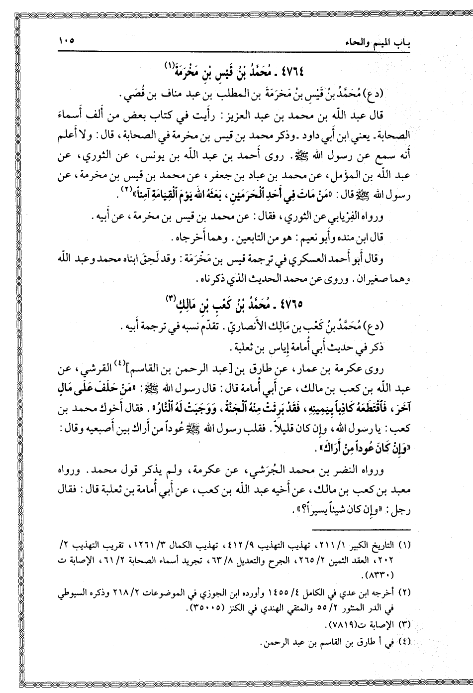 د ع: مُحَمَّد بْن قيس بْن مخرمة بْن المطلب بْن عبد مناف بْن قصي قَالَ عَبْد اللَّهِ بْن مُحَمَّد بْن عبد العزيز: رأيت فِي كتاب بعض من ألف أسماء الصحابة يعني: ابن أَبِي داود، وذكر مُحَمَّد بْن قيس بْن مخرمة فِي الصحابة، قَالَ: ولا أعلم أَنَّهُ سمع عن رَسُول اللَّهِ صَلَّى اللَّهُ عَلَيْهِ وَسَلَّمَ روى أحمد بْن عَبْد اللَّهِ بْن يونس، عن الثوري، عن عَبْد اللَّهِ بْن المؤمل، عن مُحَمَّدِ بْنِ عباد بْن جَعْفَر، عن مُحَمَّدِ بْنِ قيس بْن مخرمة، عن رَسُول اللَّهِ صَلَّى اللَّهُ عَلَيْهِ وَسَلَّمَ قَالَ: " من مات فِي أحد الحرمين، بعثه اللَّه يَوْم القيامة آمنا ".