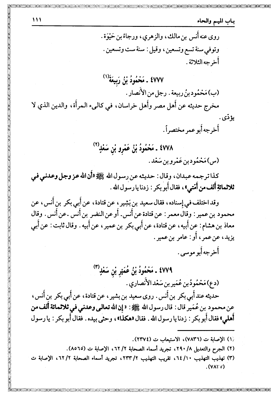 س: مَحْمُود بْن عَمْرو بْن سعد كذا ترجمه عبدان، وقال: حديثه عن رَسُول اللَّهِ صَلَّى اللَّهُ عَلَيْهِ وَسَلَّمَ: " أن اللَّه عَزَّ وَجَلَّ وعدني فِي ثلاثمائة ألف من أمتي "، فقال أَبُو بكر: زدنا يا رَسُول اللَّهِ.
