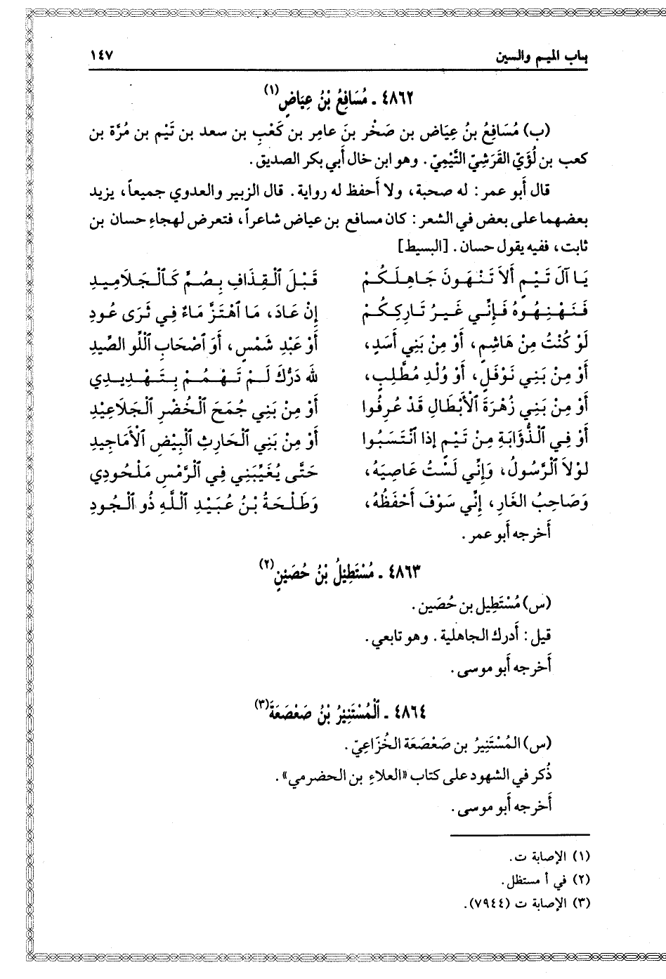 ب: مسافع بْن عياض بْن صخر بْن عَامِر بْن كعب بْن سعد بْن تيم بْن مرة بْن كعب بْن لؤي القرشي التيمي، وهو ابن خال أَبِي بكر الصديق.