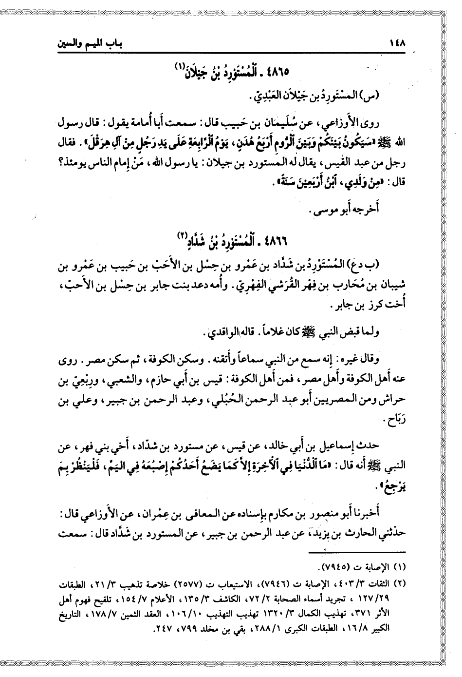 س: المستورد بْن جيلان العبدي روى الأوزاعي، عن سُلَيْمَان بْن حبيب، قَالَ: سمعت أبا أمامة، يقول: قَالَ رَسُول اللَّهِ صَلَّى اللَّهُ عَلَيْهِ وَسَلَّمَ: " سيكون بينكم وبين الروم أربع هدن، يَوْم الرابعة عَلَى يد رجل من آل هرقل "، فقال رجل من عبد القيس، يقال لَهُ: المستورد بْن جيلان: يا رَسُول اللَّهِ، من إمام الناس يومئذ؟ قَالَ: " من ولدي، ابن أربعين سنة ".