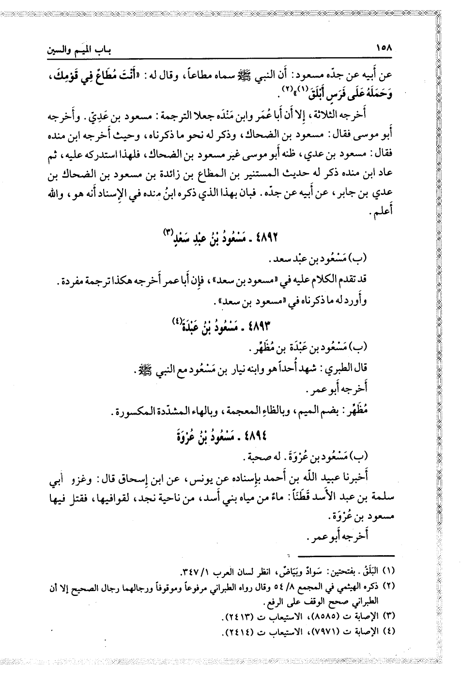 ب: مسعود بْن عبد سعد قد تقدم الكلام عَلَيْهِ فِي مسعود بْن سعد، فإن أبا عمر أخرجه هكذا ترجمة مفردة، وأورد لَهُ ما ذكرناه فِي مسعود بْن سعد.