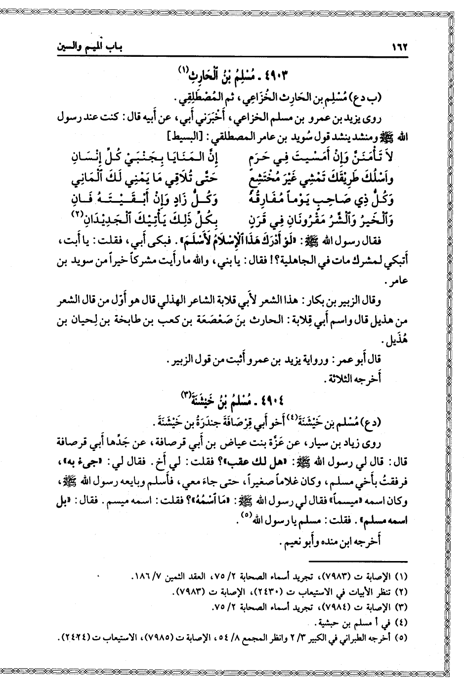 ب د ع: مسلم بْن الحارث الخزاعي ثُمَّ المصطلقي ٢٤٩٧ روى يزيد بْن عَمْرو بْن مسلم الخزاعي، أَخْبَرَنِي أَبِي، عن أبيه، قَالَ: كنت عند رَسُول اللَّهِ صَلَّى اللَّهُ عَلَيْهِ وَسَلَّمَ ومنشد ينشد قول سويد بْن عَامِر المصطلقي: