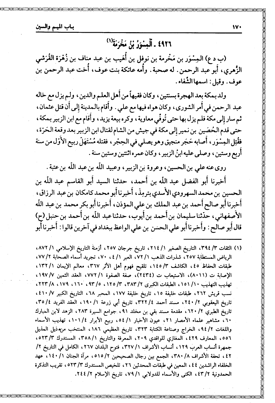 ب د ع: المسور بْن مخرمة بْن نوفل بْن أهيب بْن عبد مناف بْن زهرة القرشي الزُّهْرِيّ، أَبُو عبد الرحمن، لَهُ صحبة، وأمه عاتكة بنت عوف أخت عبد الرحمن بْن عوف، وقيل: اسمها الشفاء.