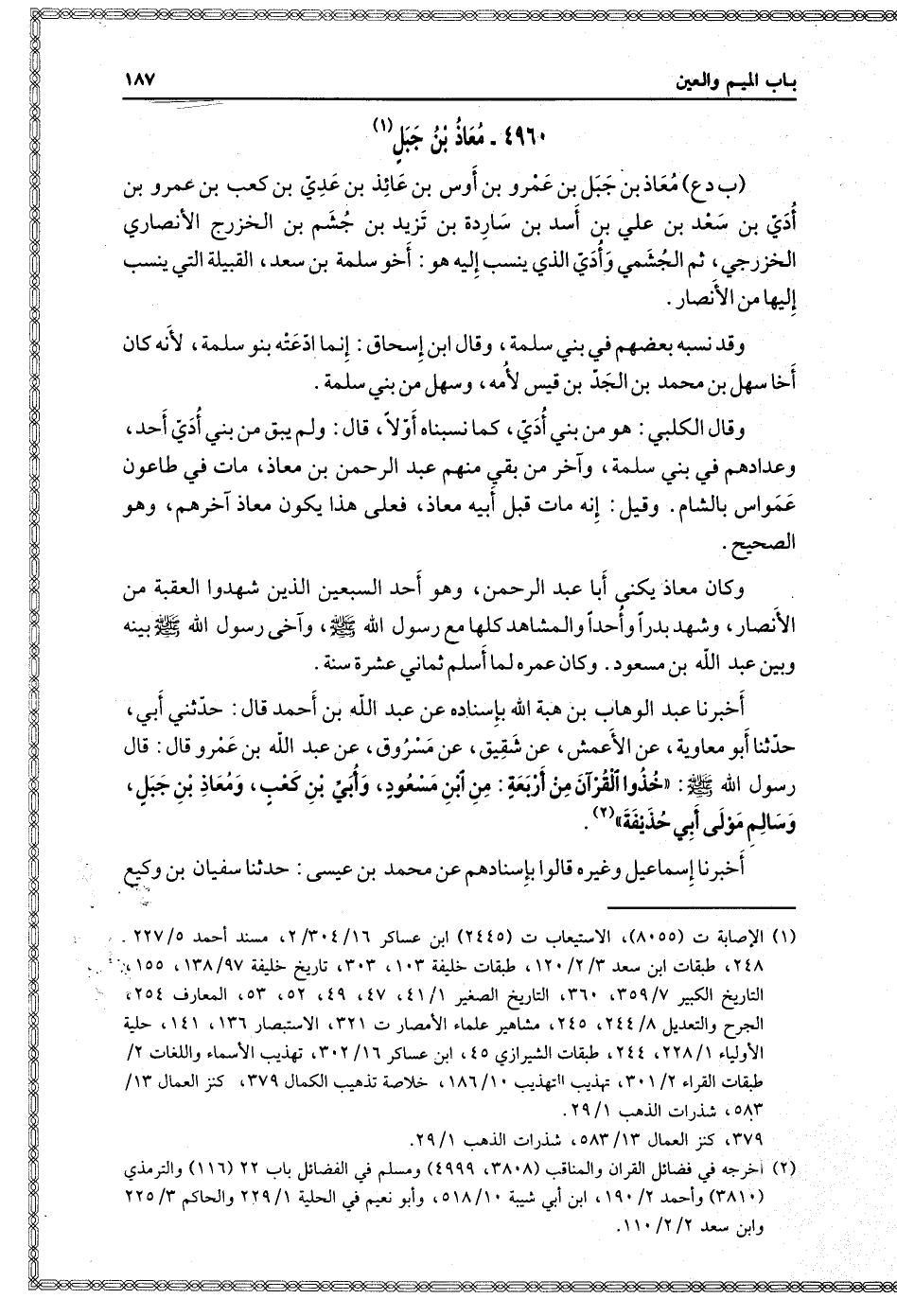 وَكَانَ معاذ يكنى أبا عبد الرحمن، وهو أحد السبعين الَّذِينَ شهدوا العقبة من الأنصار، وشهد بدرا وأحدا، والمشاهد كلها مع رَسُول اللَّهِ صَلَّى اللَّهُ عَلَيْهِ وَسَلَّمَ وآخى رَسُول اللَّهِ صَلَّى اللَّهُ عَلَيْهِ وَسَلَّمَ بينه وبين عَبْد اللَّهِ بْن مسعود.