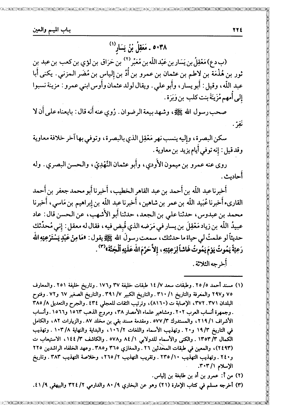 ب د ع: معقل بْن يسار بْن عَبْد اللَّهِ بْن معبر بْن حراق بْن لأي بْن كعب بْن عبد بْن ثور بْن هذمة بْن لاطم بْن عثمان بْن عَمْرو بْن أد بْن إلياس بْن مضر المزني، يكنى أبا عَبْد اللَّهِ، وقيل: أَبُو يسار، وَأَبُو عَليّ.