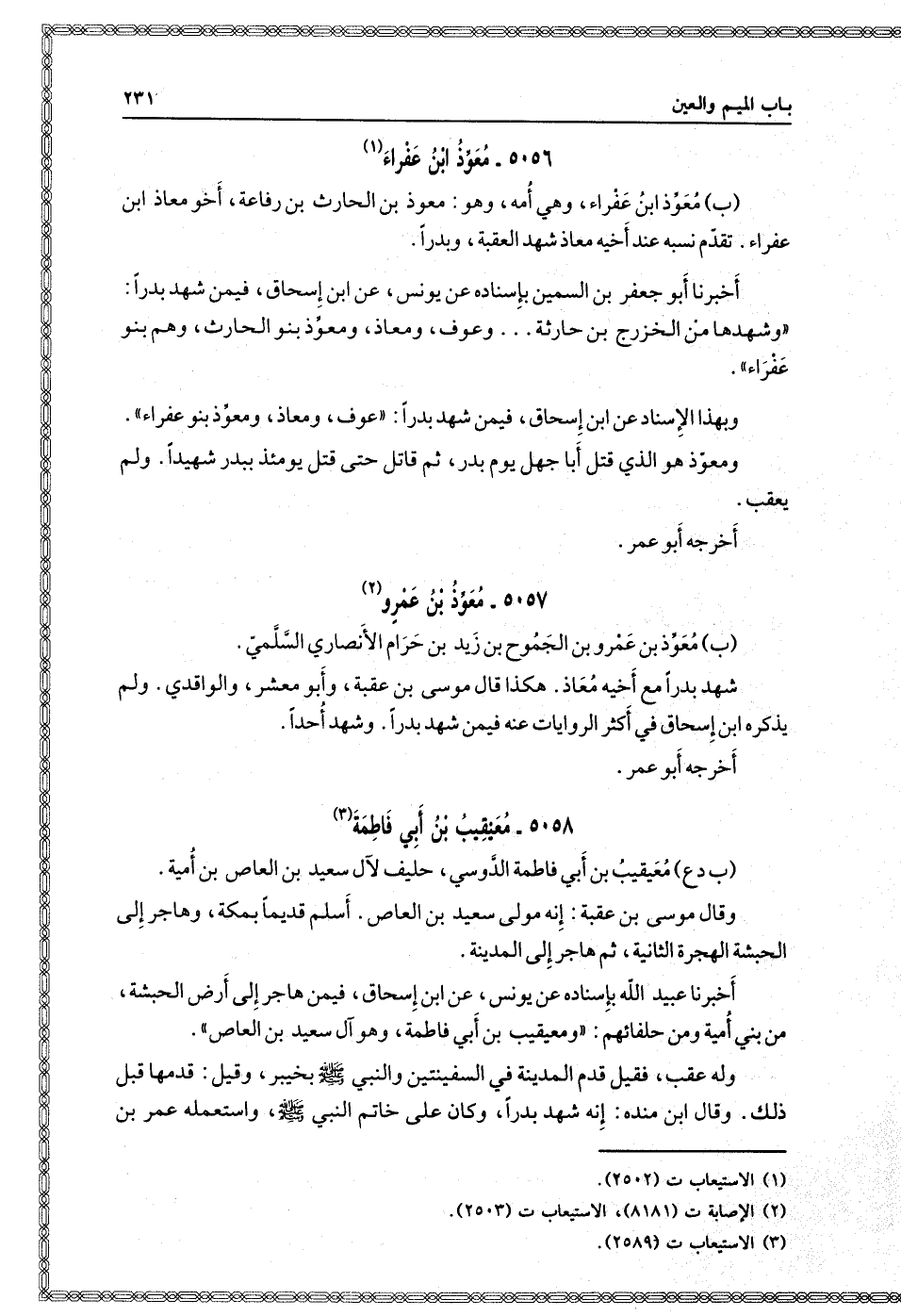 (١٥٧٦) أَخْبَرَنَا أَبُو جَعْفَرِ ابْنُ السَّمِينِ بِإِسْنَادِهِ، عن يُونُسَ، عن ابْنِ إِسْحَاقَ، فِيمَنْ شَهِدَ بَدْرًا: وَشَهِدَهَا مِنَ الْخَزْرَجِ ابْنُ حَارِثَةَ وَعَوْفٌ وَمُعَاذٌ وَمُعَوَّذٌ، بَنُو الْحَارِثِ، وَهُمْ بَنُو عَفْرَاءَ