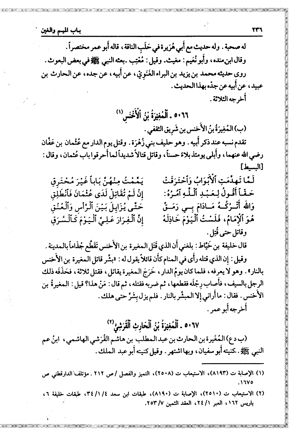 ب: المغيرة بْن الأخنس بْن شريق الثقفي تقدم نسبه عند ذكر أبيه، وهو حليف بني زهرة، وقتل يَوْم الدار مع عثمان بْن عفان رضي اللَّه عَنْهُما، وأبلى يومئذ بلاء حسنا، وقاتل قتالا شديدا لِمَا أحرقوا باب عثمان، وقال: