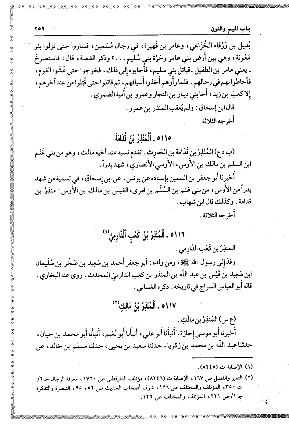 ب د ع: المنذر بْن قدامة بْن الحارث، تقدم نسبه عند أخيه مالك، وهو من بني غنم بْن السلم بْن مالك بْن الأوس، الأوسي الأنصاري، شهد بدرا.