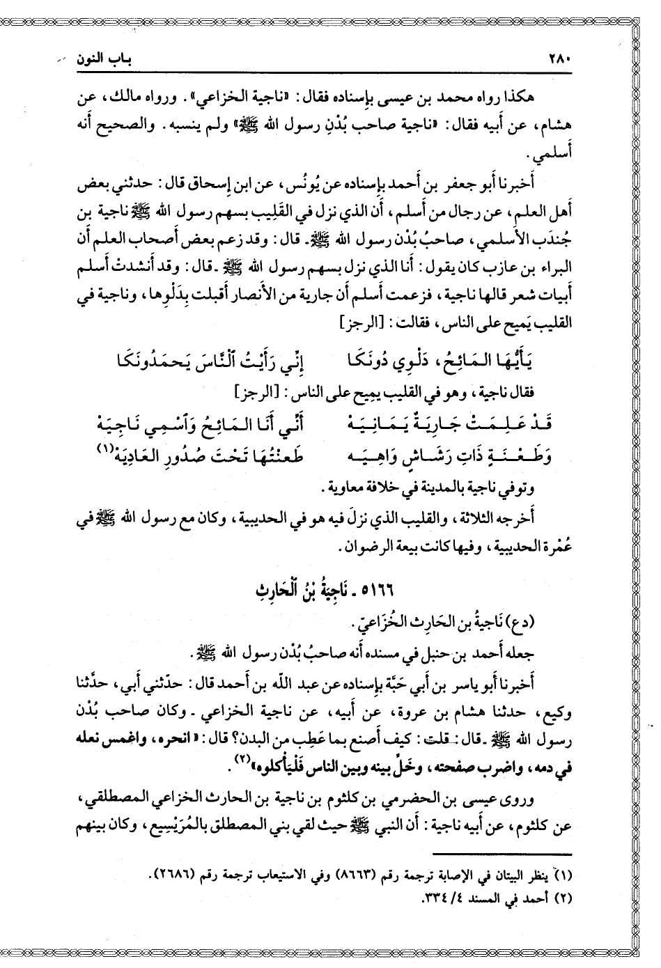 (١٦١٠) أَخْبَرَنَا أَبُو يَاسِرِ ابْنُ أَبِي حَبَّةَ بِإِسْنَادِهِ، عن عَبْدِ اللَّهِ بْنِ أَحْمَدَ، قَالَ: حَدَّثَنِي أَبِي، حدثنا وَكِيعٌ، حدثنا هِشَامُ بْنُ عُرْوَةَ، عن أَبِيهِ، عن نَاجِيَةَ الْخُزَاعِيِّ، وَكَانَ صَاحِبَ بُدْنِ رَسُولِ اللَّهِ صَلَّى اللَّهُ عَلَيْهِ وَسَلَّمَ قَالَ: قُلْتُ: كَيْفَ أَصْنَعُ بِمَا عَطِبَ مِنَ الْبُدْنِ؟ قَالَ: " انْحَرْهُ، وَاغْمِسْ نَعْلَهُ فِي دَمِهِ، وَاضْرِبْ صَفْحَتَهُ، وَخَلِّ بَيْنَهُ وَبَيْنَ النَّاسِ فَلْيَأْكُلُوهُ " وروى عِيسَى بْن الحضرمي بْن كلثوم بْن ناجية بْن الحارث الخزاعي المصطلقي، عن جده كلثوم، عن أبيه ناجية، أن النَّبِيّ صَلَّى اللَّهُ عَلَيْهِ وَسَلَّمَ حَيْثُ لقي بني المصطلق بالمريسيع، وَكَانَ بينهم ما قضى اللَّه عَزَّ وَجَلَّ ثُمَّ أصبحت بالمصطلق وهداهم اللَّه عَزَّ وَجَلَّ للإسلام، وبايعوا رَسُول اللَّهِ فقبل منهم، ثُمَّ أمسك صاحبتهم جويرية بنت الحارث.