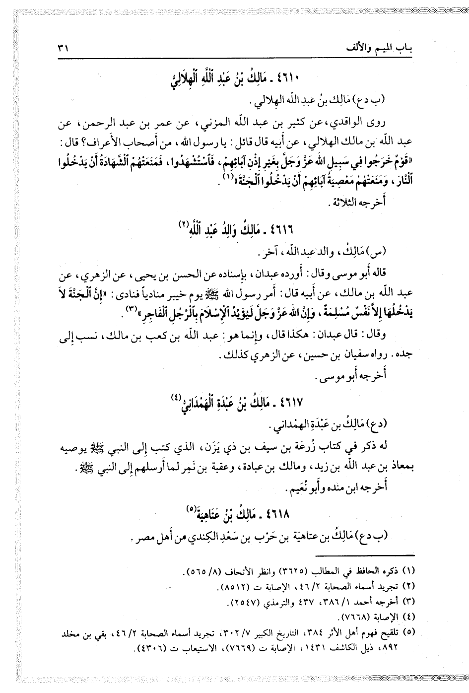 ب د ع: مالك بْن عَبْد اللَّهِ الهلالي روى الواقدي، عن كَثِير بْن عَبْد اللَّهِ المزني، عن عمر بْن عبد الرحمن، عن عَبْد اللَّهِ بْن مالك الهلالي، عن أبيه: " قَالَ قائل: يا رَسُول اللَّهِ، من أصحاب الأعراف؟ قَالَ: قوم خرجوا فِي سبيل اللَّه عَزَّ وَجَلَّ بغير إذن آبائهم فاستشهدوا، فمنعتهم الشهادة أن يدخلوا النار، ومنعتهم معصية آبائهم أن يدخلوا الجنة ".