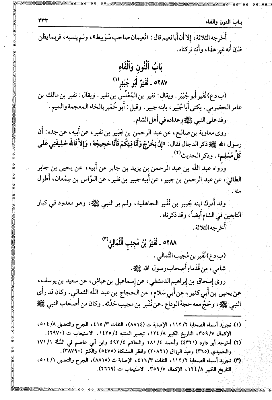 وقد أدرك ابنه جبير بن نفير الجاهلية، ولم ير النَّبِيّ صَلَّى اللَّهُ عَلَيْهِ وَسَلَّمَ وهو معدود فِي كبار التابعين فِي الشام أيضا، وقد ذكرناه.