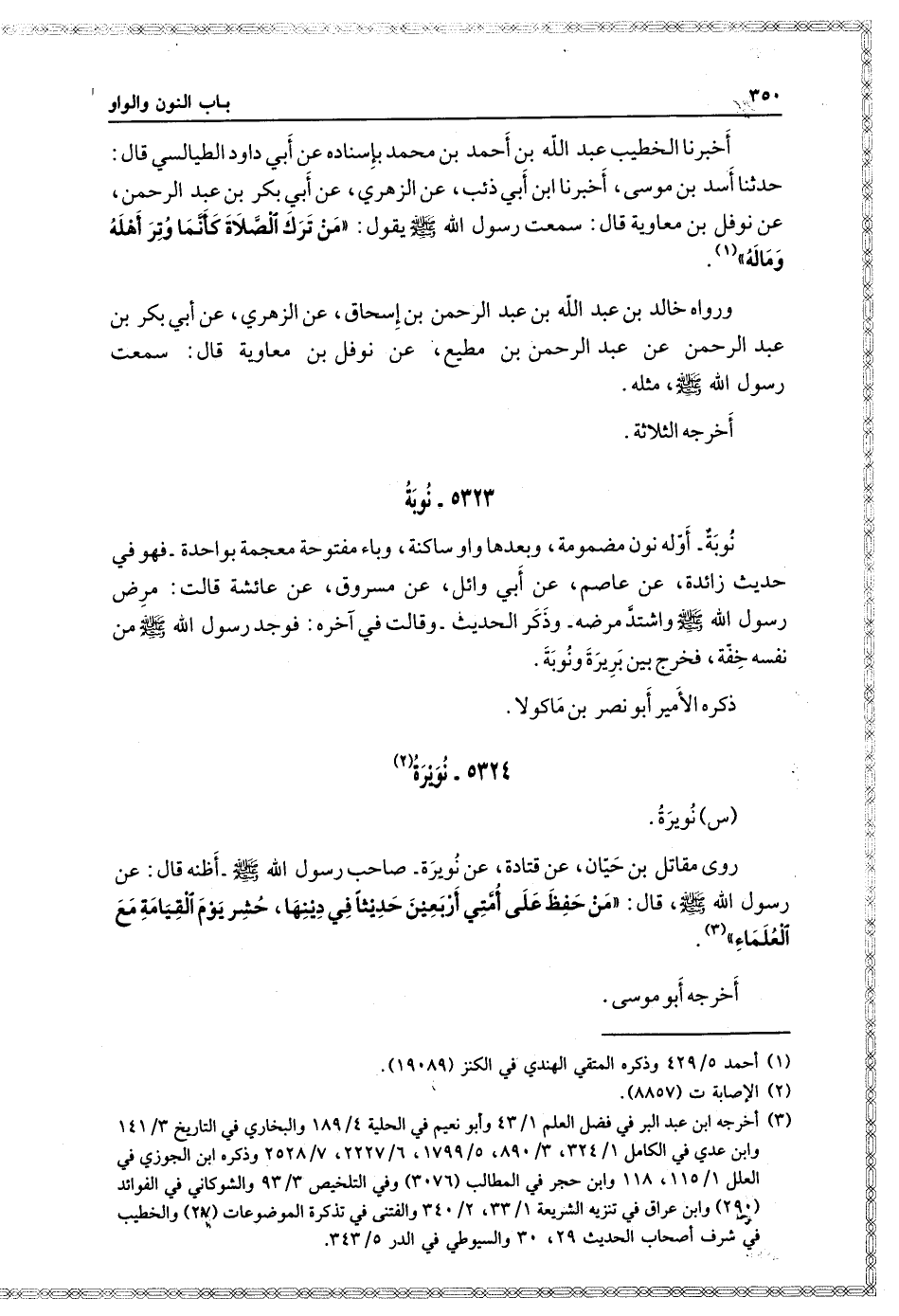 س: نويرة روى مقاتل بن حيان، عن قتادة، عن نويرة صاحب رسول الله صَلَّى اللَّهُ عَلَيْهِ وَسَلَّمَ أظنه قَالَ: عن رسول الله صَلَّى اللَّهُ عَلَيْهِ وَسَلَّمَ قَالَ: " من حفظ عَلَى أمتي أربعين حديثا فِي دينها، حشر يوم القيامة مع العلماء ".