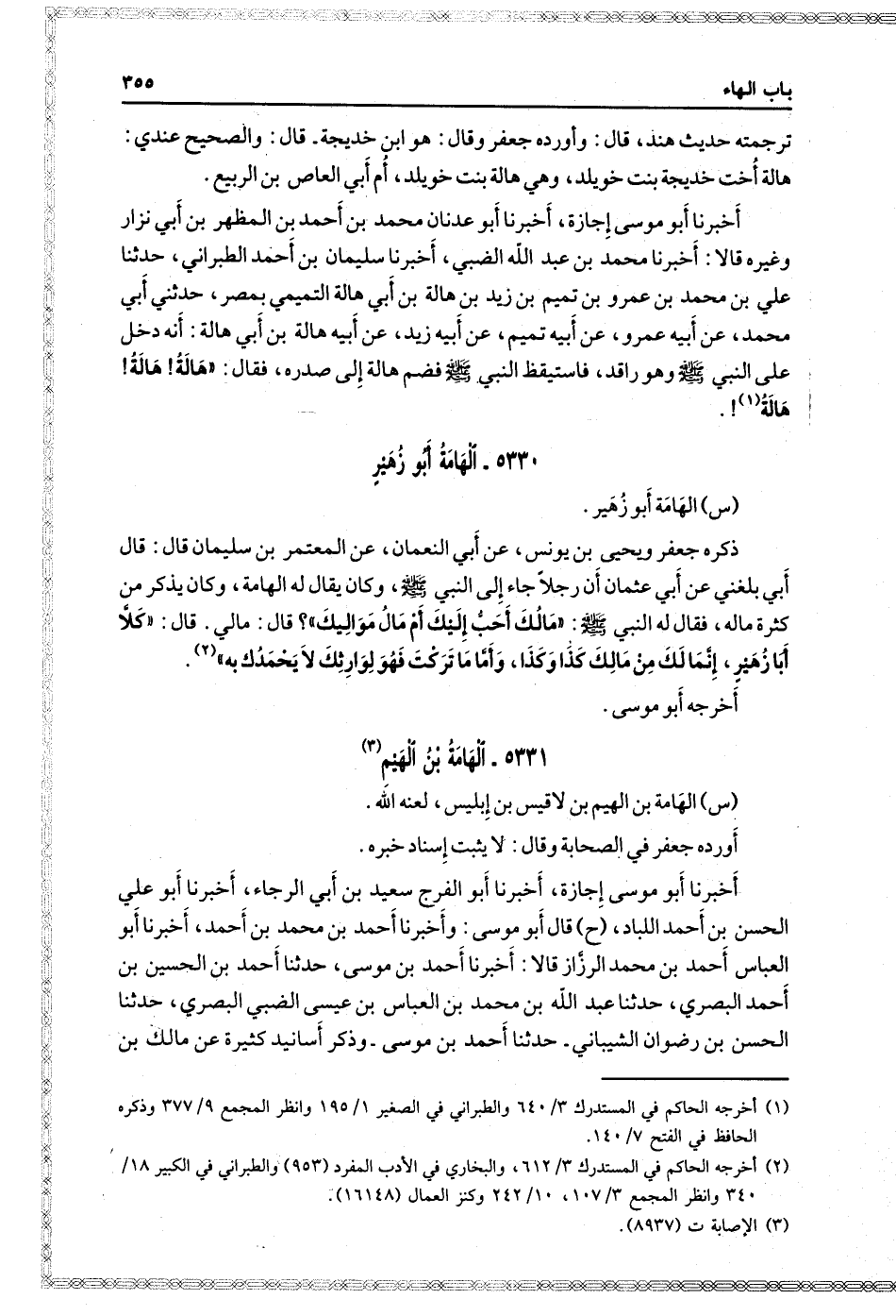 س: الهامة أَبُو زهير ذكره جَعْفَر، وَيَحْيَى بن يونس، عن أبي النعمان، عن المعتمر بن سُلَيْمَان، قَالَ: قَالَ أبي: بلغني عن أبي عثمان: أن رجلا جاء إلى النَّبِيّ صَلَّى اللَّهُ عَلَيْهِ وَسَلَّمَ وَكَانَ يقال لَهُ: الهامة، وَكَانَ يذكر من كثرة ماله، فقال لَهَ النَّبِيّ صَلَّى اللَّهُ عَلَيْهِ وَسَلَّمَ: " مالك أحب إليك أم مال مواليك؟ قَالَ: مالي، قَالَ: " كلا يا أبا زهير، إنما لك من مالك كذا وكذا، وأما ما تركت فهو لوارثك لا يحمدك بِهِ ".