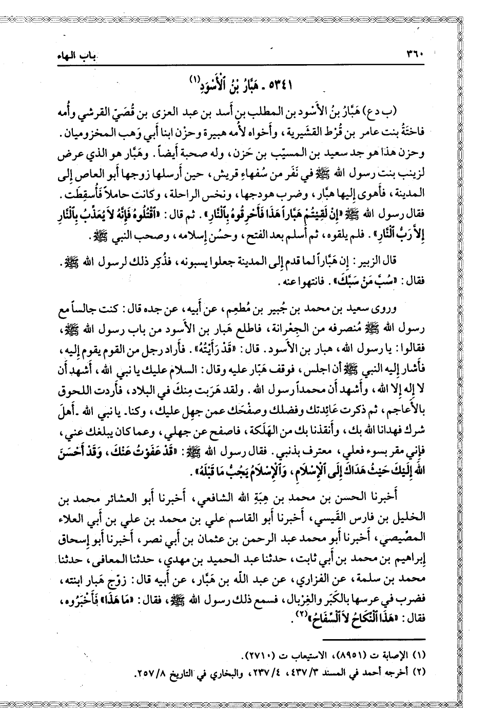 وحزن هَذَا هُوَ جد سعيد بن المسيب بن حزن، وله صحبة أيضا، وهبار هُوَ الَّذِي عرض لزينب بنت رسول الله صَلَّى اللَّهُ عَلَيْهِ وَسَلَّمَ فِي نفر من سفهاء قريش، حين أرسلها زوجها أَبُو العاص إلى المدينة، فأهوى إليها هبار، وضرب هودجها، ونخس الراحلة، وكانت حاملا فأسقطت، فقال رسول الله صَلَّى اللَّهُ عَلَيْهِ وَسَلَّمَ: " إن لقيتم هبارا هَذَا فأحرقوه بالنار "، ثُمَّ قَالَ: " اقتلوه فإنه لا يعذب بالنار إلا رب النار "، فلم يلقوه، ثُمَّ أسلم بعد الفتح، وحسن إسلامه وصحب النَّبِيّ صَلَّى اللَّهُ عَلَيْهِ وَسَلَّمَ الزبير: إن هبارا لِمَا قدم إلى المدينة جعلوا يسبونه، فذكر ذَلِكَ لرسول الله صَلَّى اللَّهُ عَلَيْهِ وَسَلَّمَ فقال: " سب من سبك "، فانتهوا عَنْهُ.