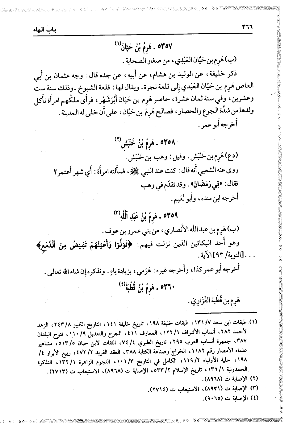 ب: هرم بن حيان العبدي من صغار الصحابة ذكر خليفة، عن الوليد بن هِشَام، عن أبيه، عن جده، قَالَ: وجه عثمان بن أبي العاص هرم بن حيان العبدي إلى قلعة نجرة، ويقال لَهَا: قلعة الشيوخ، وَذَلِكَ سنة ست وعشرين، وَفِي سنة ثمان عشرة، حاصر هرم بن حيان أبرشهر، فرأى ملكهم امرأة تأكل ولدها من شدة الجوع والحصار، فصالح هرم بن حيان، عَلَى أن خلى لَهُ المدينة.