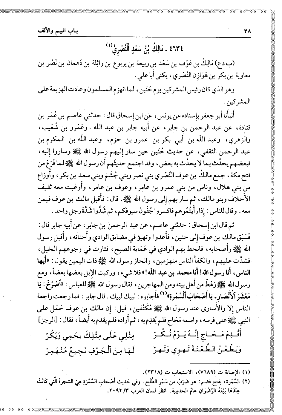 ثُمَّ قَالَ ابْنُ إِسْحَاقَ: حَدَّثَنِي عَاصِمٌ، عن عَبْدِ الرَّحْمَنِ بْنِ جَابِرٍ، عن أَبِيهِ جَابِرٍ، قَالَ: فَسَبَقَ مَالِكُ بْنُ عَوْفٍ إِلَى حُنَيْنٍ فَأَعَدُّوا وَتَهَيَّئُوا فِي مَضَايِقِ الْوَادِي وَأَحْنَائِهِ، وَأَقْبَلَ رَسُولُ اللَّهِ صَلَّى اللَّهُ عَلَيْهِ وَسَلَّمَ وَأَصْحَابُهُ، فَانْحَطَّ بِهِمُ الْوَادِي فِي عِمَايَةِ الصُّبْحِ، فَثَارَتْ فِي وُجُوهِهُمُ الْخَيْلُ، فَشَدَّتْ عَلَيْهِمْ، وَانْكَفَأَ النَّاسُ مُنْهَزِمِينَ، وَانْحَازَ رَسُولُ اللَّهِ صَلَّى اللَّهُ عَلَيْهِ وَسَلَّمَ ذَاتَ الْيَمِينِ يَقُولُ: " أَيُّهَا النَّاسُ، أَنَا رَسُولُ اللَّهِ، أَنَا مُحَمَّدُ بْنُ عَبْدِ اللَّهِ، فَلا شَيْءَ "، وَرَكِبَتِ الإِبِلُ بَعْضَهَا بَعْضًا، وَمَعَ رَسُولِ اللَّهِ صَلَّى اللَّهُ عَلَيْهِ وَسَلَّمَ رَهْطٌ مِنْ أَهْلِ بَيْتِهِ وَمِنَ الْمُهَاجِرِينَ، فَقَالَ رَسُولُ اللَّهِ صَلَّى اللَّهُ عَلَيْهِ وَسَلَّمَ لِلْعَبَّاسِ: " اصْرُخْ: يَا مَعْشَرَ الأَنْصَارِ، يَا أَصْحَابَ السَّمُرَةِ "، فَأَجَابُوهُ: لَبَّيْكَ لَبَّيْكَ، قَالَ جَابِرٌ: فَمَا رَجَعَتْ رَاجِعَةُ النَّاسِ إِلا وَالأُسَارَى عِنْدَ رَسُولِ اللَّهِ صَلَّى اللَّهُ عَلَيْهِ وَسَلَّمَ مُكَتَّفِينَ، قِيلَ: إِنَّ مَالِكَ بْنَ عَوْفٍ حَمَلَ عَلَى النَّبِيِّ صَلَّى اللَّهُ عَلَيْهِ وَسَلَّمَ عَلَى فَرَسِهِ، وَاسْمُهُ مَحَاجِ فَلَمْ يَقْدَمْ بِهِ، ثُمَّ أَرَادَهُ فَلَمْ يَقْدَمْ بِهِ أَيْضًا، فَقَالَ: