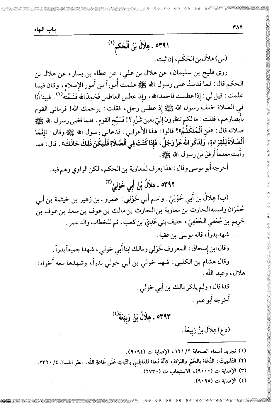 س: هلال بن الحكم إن ثبت روى فليح بن سُلَيْمَان، عن هلال بن عَليّ، عن عطاء بن يسار، عن هلال بن الحكم، قَالَ: لِمَا قدمت عَلَى رسول الله صَلَّى اللَّهُ عَلَيْهِ وَسَلَّمَ علمت أمورا من أمور الإسلام، وَكَانَ فيما علمت: قيل لي: إذا عطست فاحمد الله، وَإِذَا عطس العاطس فحمد الله فشمته، فبينا أنا فِي الصلاة خلف رسول الله صَلَّى اللَّهُ عَلَيْهِ وَسَلَّمَ إذ عطس رجل، فقلت: يرحمك الله، فرماني القوم بأبصارهم، فقلت: ما لكم تنظرون إلي بعين شزر؟ ! فسبح القوم، فلما قضى رسول الله صَلَّى اللَّهُ عَلَيْهِ وَسَلَّمَ صلاته، قَالَ: " من المتكلم؟ " قالوا: هَذَا الأعرابي، فدعاني رسول الله صَلَّى اللَّهُ عَلَيْهِ وَسَلَّمَ وقال: " إنما الصلاة للقراءة ولذكر الله عَزَّ وَجَلَّ فإذا كنت فِي الصلاة فليكن ذَلِكَ حالك "، قَالَ: فما رأيت معلما أرفق من رسول الله صَلَّى اللَّهُ عَلَيْهِ وَسَلَّمَ أبو موسى وقال: هَذَا يعرف لمعاوية بن الحكم، لكن الراوي وهم فِيهِ.