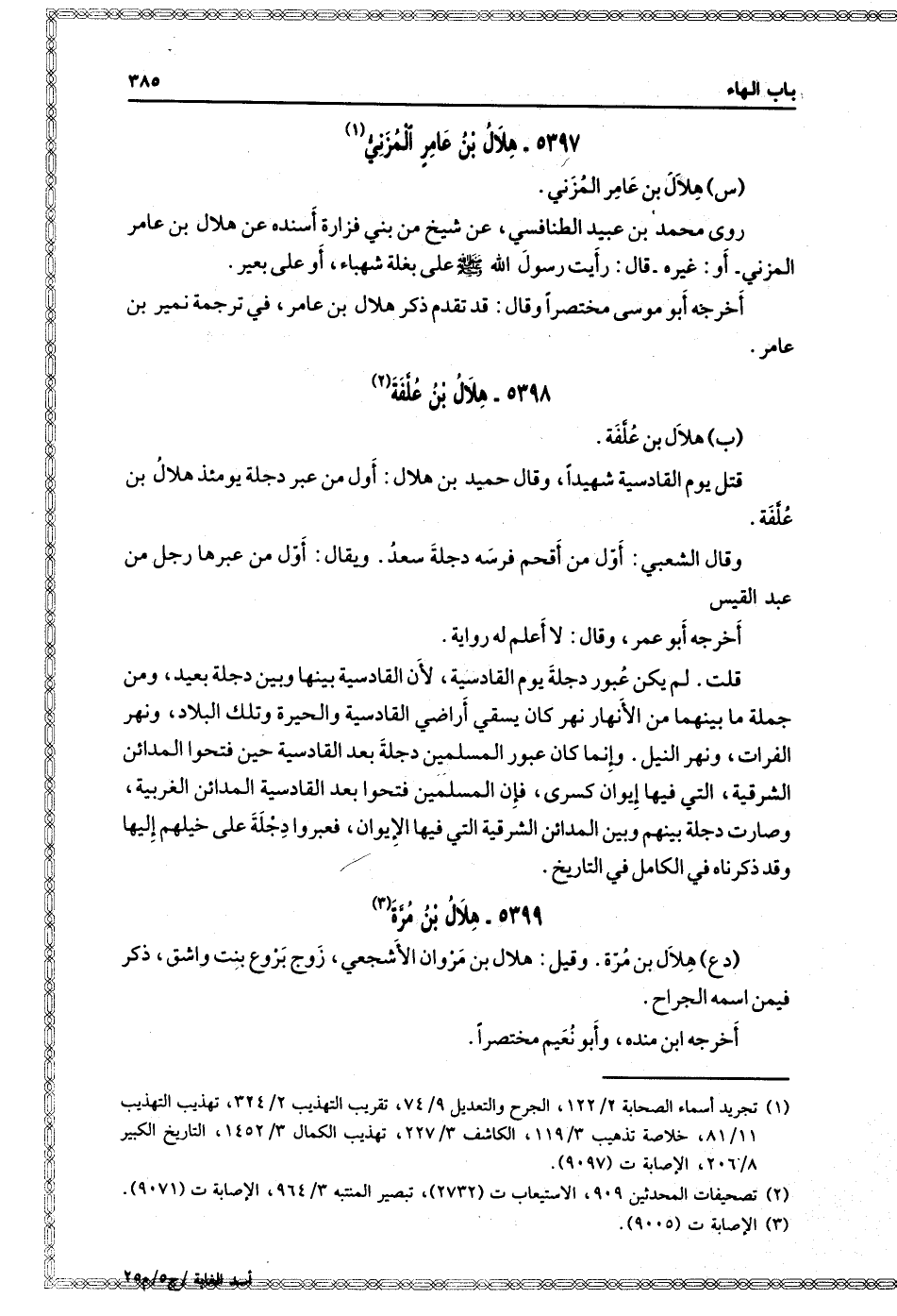 ب: هلال بن علفة قتل يوم القادسية شهيدا، وقال حميد بن هلال: أول من عبر دجلة يومئذ هلال بن علفة.