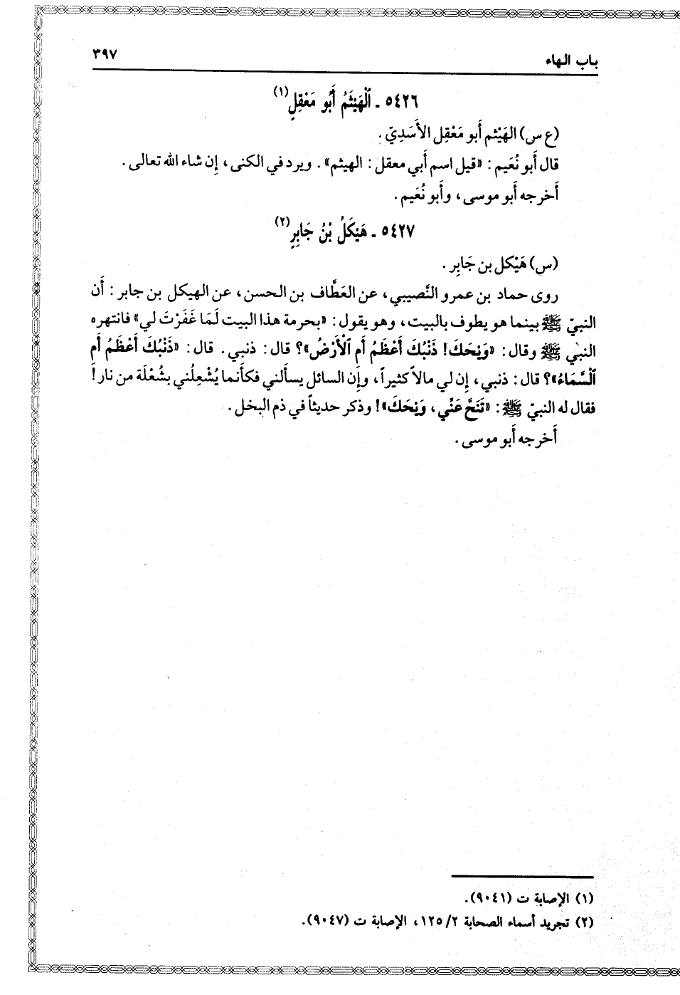 س: هيكل بن جابر روى حماد بن عَمْرو النصيبي، عن العطاف بن الْحَسَن، عن الهيكل بن جابر، أن النَّبِيّ صَلَّى اللَّهُ عَلَيْهِ وَسَلَّمَ بينما هُوَ يطوف بالبيت، وهو يقول: بحرمة هَذَا البيت لِمَا غفرت لي، فانتهره النَّبِيّ صَلَّى اللَّهُ عَلَيْهِ وَسَلَّمَ وقال: " ويحك، ذنبك أعظم أم الأرض؟ " قَالَ: ذنبي، قَالَ: " ذنبك أعظم أم السماء؟ " قَالَ: ذنبي، إن لي مالا كثيرا، وإن السائل يسألني فكأنما يشعلني بشعلة من نار، فقال لَهُ النَّبِيّ صَلَّى اللَّهُ عَلَيْهِ وَسَلَّمَ: " تنح عني، ويحك "، وذكر حديثا فِي ذم البخل.