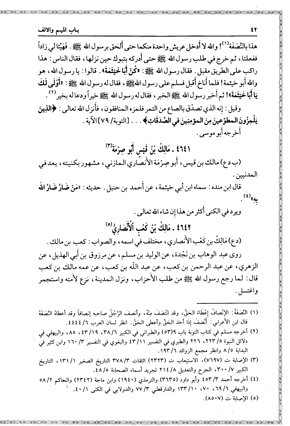 ب د ع: مالك بْن قيس أَبُو صرمة الأنصاري المازني مشهور بكنيته يعد فِي المدنيين قَالَ ابن منده: سماه ابن أَبِي خيثمة، عن أحمد بْن حنبل حديثه: " من ضار ضار اللَّه بِهِ ".