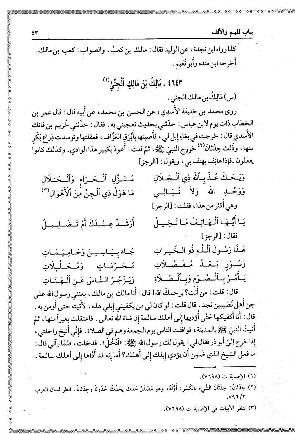 س: مالك بْن مالك الجني روى مُحَمَّد بْن خليفة الأسدي، عن الْحَسَن بْن مُحَمَّد، عن أبيه، قَالَ: قَالَ عمر بْن الخطاب ذات يَوْم لابن عباس: حَدَّثَنِي بحديث تعجبني بِهِ، فقال: حَدَّثَنِي خريم بْن فاتك الأسدي، قَالَ: " خرجت فِي بغاء إبل لي، فأصبتها بأبرق العزاف، فعقلتها وتوسدت ذراع بكر منها، وَذَلِكَ حدثان خروج النَّبِيّ صَلَّى اللَّهُ عَلَيْهِ وَسَلَّمَ ثُمَّ قلت: أعوذ بكبير هَذَا الوادي، وكذلك كانوا يفعلون، فإذا هاتف يهتف بي، ويقول: