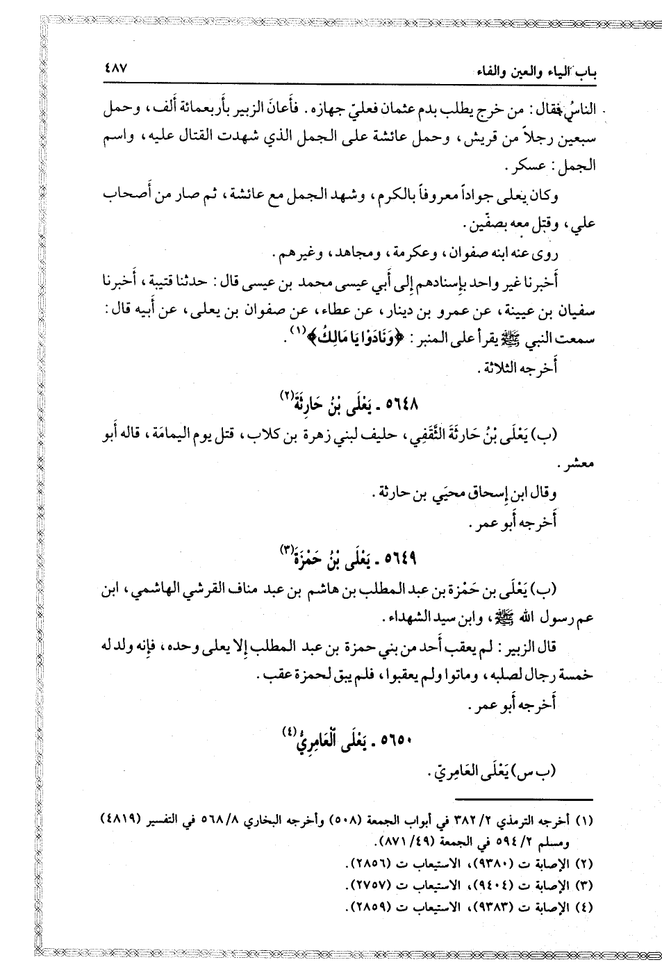 ب: يعلى بن حَمْزَة بن عبد المطلب بن هاشم بن عبد مناف القرشي الهاشمي ابن عم رسول الله صَلَّى اللَّهُ عَلَيْهِ وَسَلَّمَ وابن سيد الشهداء قَالَ الزبير: لَمْ يعقب أحد من بني حَمْزَة بن عبد المطلب إلا يعلى وحده، فإنه ولد لَهُ خمسة رجال لصلبه، وماتوا ولم يعقبوا، فلم يبق لحمزة عقب.