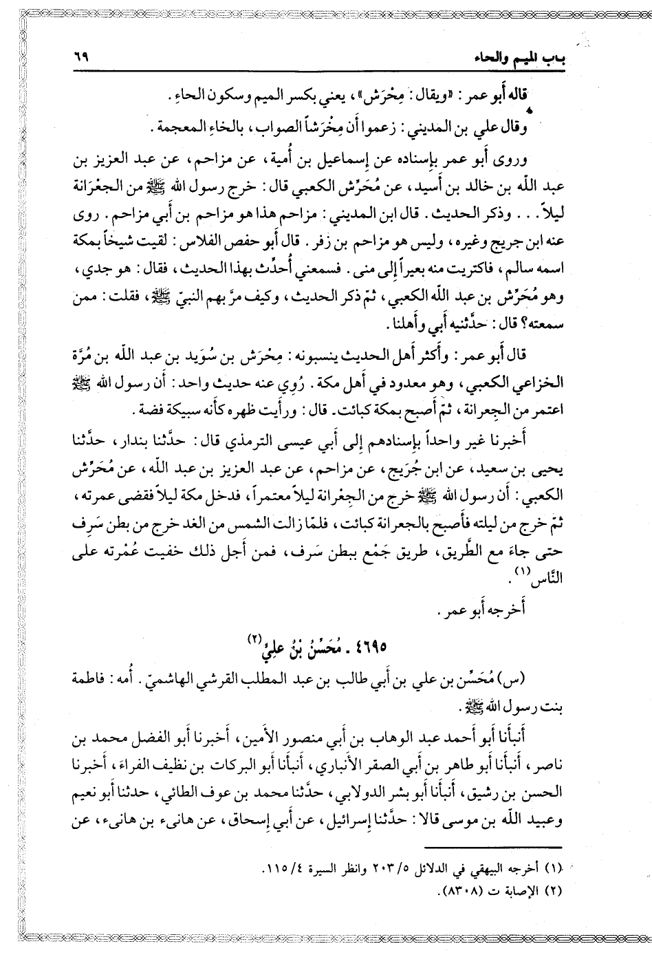(١٤٦٦) أَنْبَأَنَا أَبُو أَحْمَدَ عَبْدُ الْوَهَّابِ بْنُ أَبِي مَنْصُورٍ الأَمِينُ، أَخْبَرَنَا أَبُو الْفَضْلِ مُحَمَّدُ بْنُ نَاصِرٍ، أَنْبَأَنَا أَبُو طَاهِرِ ابْنُ أَبِي الصَّقْرِ الأَنْبَارِيُّ، أَنْبَأَنَا أَبُو الْبَرَكَاتِ بْنُ نَظِيفٍ الْفَرَّاءُ، أَخْبَرَنَا الْحَسَنُ بْنُ رَشِيقٍ، أَنْبَأَنَا أَبُو بِشْرٍ الدَّوْلابِيُّ، حدثنا مُحَمَّدُ بْنُ عَوْفٍ الطَّائِيُّ، حدثنا أَبُو نُعَيْمٍ وَعُبَيْدُ اللَّهِ بْنُ مُوسَى، قَالا: حدثنا إِسْرَائِيلُ، عن أَبِي إِسْحَاقَ، عن هَانِئِ بْنِ هَانِئٍ، عن عَلِيٍّ، قَالَ: لَمَّا وُلِدَ الْحَسَنُ سَمَّيْتُهُ حَرْبًا، فَجَاءَ رَسُولُ اللَّهِ صَلَّى اللَّهُ عَلَيْهِ وَسَلَّمَ فَقَالَ: " أَرُونِي ابْنِي، مَا سَمَّيْتُمُوهُ؟ " قُلْنَا: حَرْبًا، قَالَ: " بَلْ هُوَ حَسَنٌ "، فَلَمَّا وُلِدَ حُسَيْنٌ، سَمَّيْتُهُ حَرْبًا، فَجَاءَ النَّبِيُّ صَلَّى اللَّهُ عَلَيْهِ وَسَلَّمَ فَقَالَ: " أَرُونِي ابْنِي، مَا سَمَّيْتُمُوهُ؟ " قُلْنَا: حَرْبًا، فَقَالَ: " بَلْ هُوَ حُسَيْنٌ "، فَلَمَّا وُلِدَ الثَّالِثُ، سَمَّيْتُهُ حَرْبًا، فَجَاءَ النَّبِيُّ صَلَّى اللَّهُ عَلَيْهِ وَسَلَّمَ فَقَالَ: " أَرُونِي ابْنِي مَا سَمَّيْتُمُوهُ؟ "، قُلْنَا: حَرْبًا، قَالَ: " بَلْ هُوَ مُحَسِّنٌ "، ثُمَّ قَالَ: " سَمَّيْتُهُمْ بِأَسْمَاءِ وَلَدِ هَارُونَ: شَبَّرُ وَشَبَّيْرُ وَمُشَبِّرُ ".
