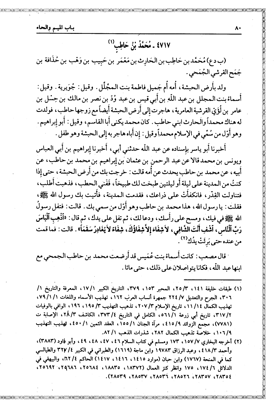 (١٤٧١) أَخْبَرَنَا أَبُو يَاسِرٍ بِإِسْنَادِهِ، عن عَبْدِ اللَّهِ، حَدَّثَنِي أَبِي، أَخْبَرَنَا إِبْرَاهِيمُ ابْنُ أَبِي الْعَبَّاسِ وَيُونُسُ بْنُ مُحَمَّدٍ، قَالا: عن عَبْدِ الرَّحْمَنِ بْنِ عُثْمَانَ بْنِ إِبْرَاهِيمَ بْنِ مُحَمَّدِ بْنِ حَاطِبٍ، عن أَبِيهِ، عن مُحَمَّدِ بْنِ حَاطِبٍ يُحَدِّثُ، عن أُمِّهِ، قَالَتْ: خَرَجْتُ بِكَ مِنْ أَرْضِ الْحَبَشَةِ، حَتَّى إِذَا كُنْتُ مِنَ الْمَدِينَةِ عَلَى لَيْلَةٍ أَوْ لَيْلَتَيْنِ طَبَخْتُ لَكَ طَبِيخًا، فَفَنَى الْحَطَبُ، فَذَهَبْتُ أَطْلُبُ، فَتَنَاوَلْتُ الْقِدْرَ، فَانْكَفَأَتْ عَلَى ذِرَاعِكَ، فَقَدِمْتُ الْمَدِينَةَ، فَأَتَيْتُ بِكَ رَسُولَ اللَّهِ صَلَّى اللَّهُ عَلَيْهِ وَسَلَّمَ فَقُلْتُ: يَا رَسُولَ اللَّهِ، هَذَا مُحَمَّدُ بْنُ حَاطِبٍ، وَهُوَ أَوَّلُ مَنْ سُمِّيَ بِكَ، قَالَتْ: فَتَفَلَ رَسُولُ اللَّهِ صَلَّى اللَّهُ عَلَيْهِ وَسَلَّمَ فِي فِيكَ، وَمَسَحَ عَلَى رَأْسِكَ، وَدَعَا لَكَ، ثُمَّ تَفَلَ عَلَى يَدِكَ، ثُمَّ قَالَ: " أَذْهِبِ الْبَاسَ رَبَّ النَّاسِ، اشْفِ أَنْتَ الشَّافِي، لا شِفَاءَ إِلا شِفَاؤُكَ، شِفَاءً لا يُغَادِرُ سَقَمًا ".