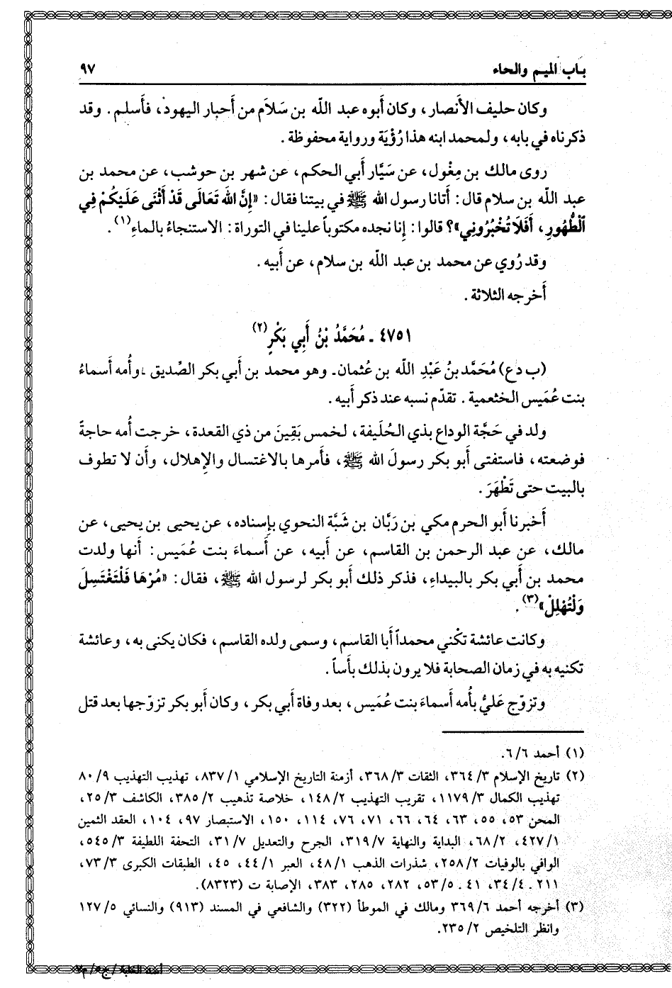 (١٤٨١) أَخْبَرَنَا أَبُو الْحَرَمِ مَكِّيُّ بْنُ رُبَّانَ بْنِ شَبَّةَ النَّحْوِيُّ بِإِسْنَادِهِ، عن يَحْيَى بْنِ يَحْيَى، عن مَالِكٍ، عن عَبْدِ الرَّحْمَنِ بْنِ الْقَاسِمِ، عن أَبِيهِ، عن أَسْمَاءَ بِنْتِ عُمَيْسٍ: أَنَّهَا وَلَدَتْ مُحَمَّدَ بْنَ أَبِي بَكْرٍ بِالْبَيْدَاءِ، فَذَكَرَ ذَلِكَ أَبُو بَكْرٍ لِرَسُولِ اللَّهِ صَلَّى اللَّهُ عَلَيْهِ وَسَلَّمَ فَقَالَ: " مُرْهَا فَلْتَغْتَسِلْ وَلْتُهَلِّلْ " وكانت عائشة تكنى مُحَمَّدا أبا الْقَاسِم، وسمى ولده الْقَاسِم، فكان يكنى بِهِ، وعائشة تكنيه بِهِ فِي زمان الصحابة، فلا يرون بذلك بأسا.