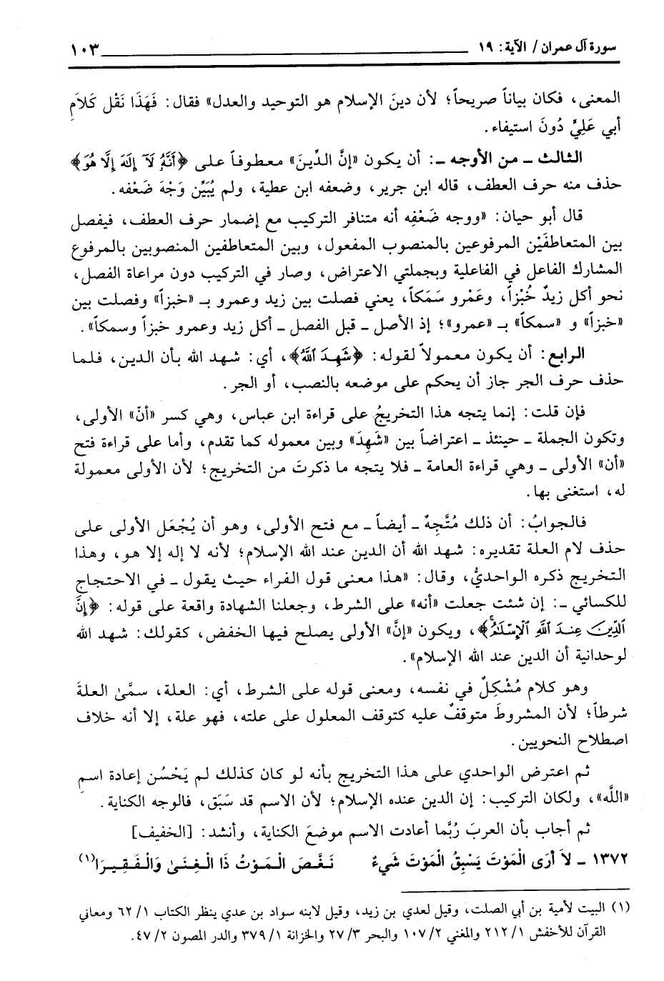 ثم اعترض الواحدي على هذا التخريج بأنه لو كان كذلك لم يَحْسُن إعادة اسم «الله» ، ولكان التركيب: إن الدين عنده الإسلام؛ لأن الاسم قد سَبَق، فالوجه الكناية.