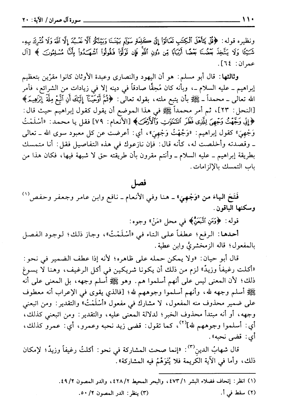 قال أبو حيان: «ولا يمكن حمله على ظاهره؛ لأنه إذا عطف الضمير في نحو:» أكلت رغيفاً وزيدٌ «لزم من ذلك أن يكونا شريكين في أكل الرغيف، وهنا لا يسوغ ذلك؛ لأن المعنى ليس على أنهم أسلموا هم. وهو صَلَّى اللَّهُ عَلَيْهِ وَسَلَّم َ أسلم وجهه، بل المعنى على أنه صَلَّى اللَّهُ عَلَيْهِ وَسَلَّم َ أسلم وجهه لله، وأنهم أسلموا وجوههم لله؛ [فالذي يقوى في الإعراب أنه معطوف على ضمير محذوف منه المفعول، لا مشارك في مفعول» أسْلَمْتُ «والتقدير: ومن اتبعني وجهه، أو أنه مبتدأ محذوف الخبر؛ لدلالة المعنى عليه، والتقدير: ومن اتبعني كذلك، أي: أسلموا وجوههم لله] ، كما تقول: قضى زيد نحبه وعمرو، أي: عمرو كذلك، أي: قضى نحبه» .