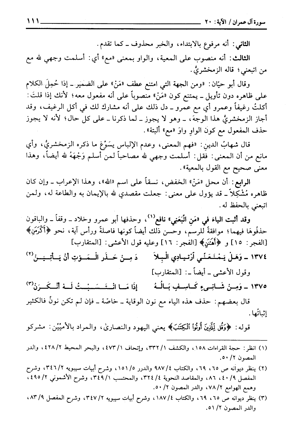الثالث: أنه منصوب على المعية، والواو بمعنى «مع» أي: أسلمت وجهي لله مع من اتبعني؛ قاله الزمخشريُّ.