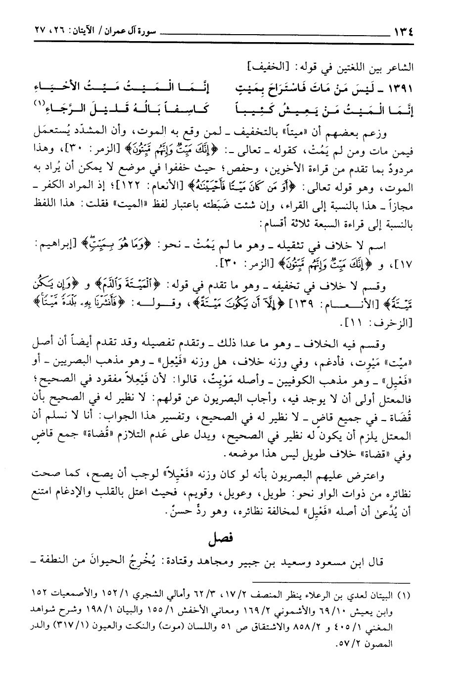 وقسم فيه الخلاف - وهو ما عدا ذلك - وتقدم تفصيله وقد تقدم أيضاً أن أصل «ميِّت» مَيْوِت، فأدغم، وفي وزنه خلاف، هل وزنه «فَيْعِل» - وهو مذهب البصريين - أو «فَعْيِل» - وهو مذهب الكوفيين - وأصله مَوْيِتٌ، قالوا: لأن فَيْعِلاً مفقود في الصحيح؛ فالمعتل أولى أن لا يوجد فيه، وأجاب البصريون عن قولهم: لا نظير له في الصحيح بأن قُضَاة - في جميع قاضٍ - لا نظير له في الصحيح، ويدل على عَدم التلازم «قُضاة» جمع قاضٍ وفي «قضاة» خلاف طويل ليس هذا موضعه.
