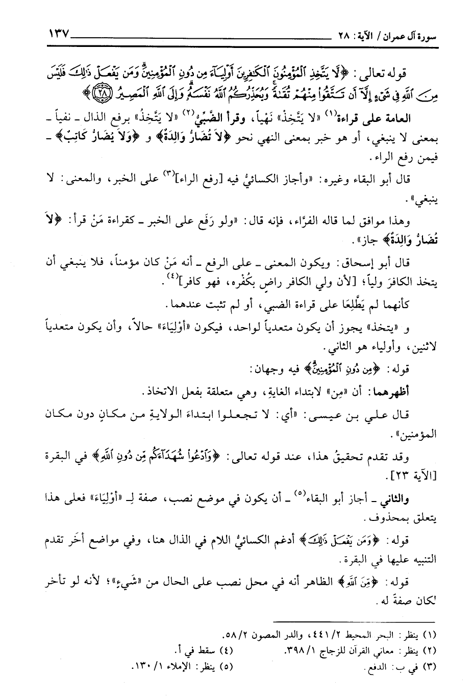 العامة على قراءة «لا يَتَّخِذْ» نَهْياً، وقرأ الضَّبِّيُّ «لا يَتَّخِذُ» برفع الذال - نفياً - بمعنى لا ينبغي، أو هو خبر بمعنى النهي نحو {لاَ تُضَآرَّ وَالِدَةٌ} [البقرة: 233] و {وَلاَ يُضَآرَّ كَاتِبٌ} [البقرة: 282]- فيمن رفع الراء.