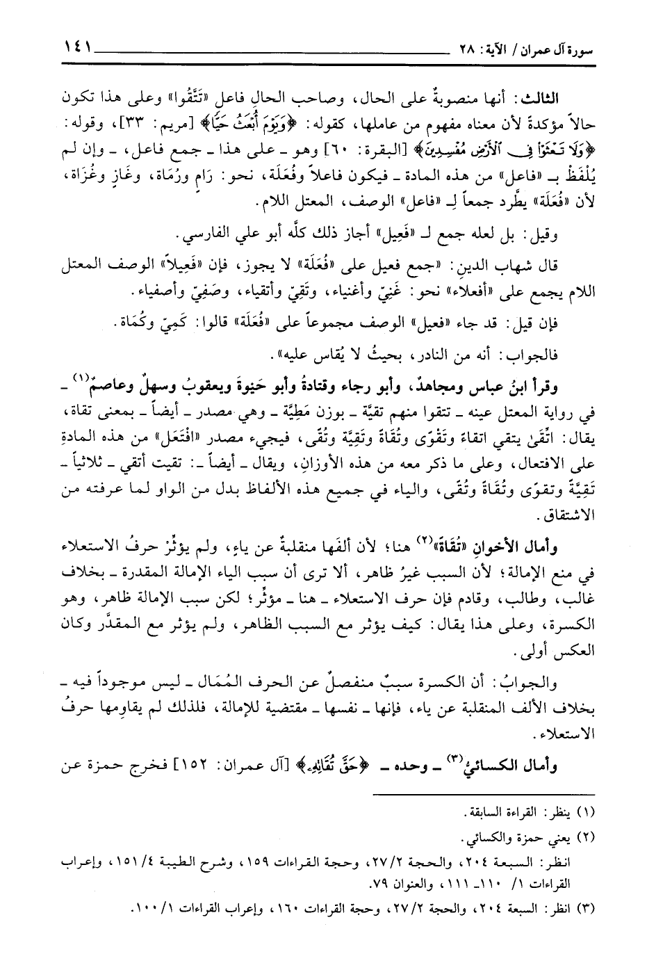 الثالث: أنها منصوبةٌ على الحال، وصاحب الحال فاعل «تَتَّقُوا» وعلى هذا تكون حالاً مؤكدةً لأن معناه مفهوم من عاملها، كقوله: {وَيَوْمَ أُبْعَثُ حَيّاً} [مريم: 33] ، وقوله: {وَلاَ تَعْثَوْاْ فِي الأرض مُفْسِدِينَ} [البقرة: 60] وهو - على هذا - جمع فاعل، - وإن لم يُلْفَظْ ب «فاعل» من هذه المادة - فيكون فاعلاً وفُعَلَة، نحو: رَامٍ ورُمَاة، وغَازٍ وغُزَاة، لأن «فُعَلَة» يطَّرد جمعاً لِ «فاعل» الوصف، المعتل اللام.