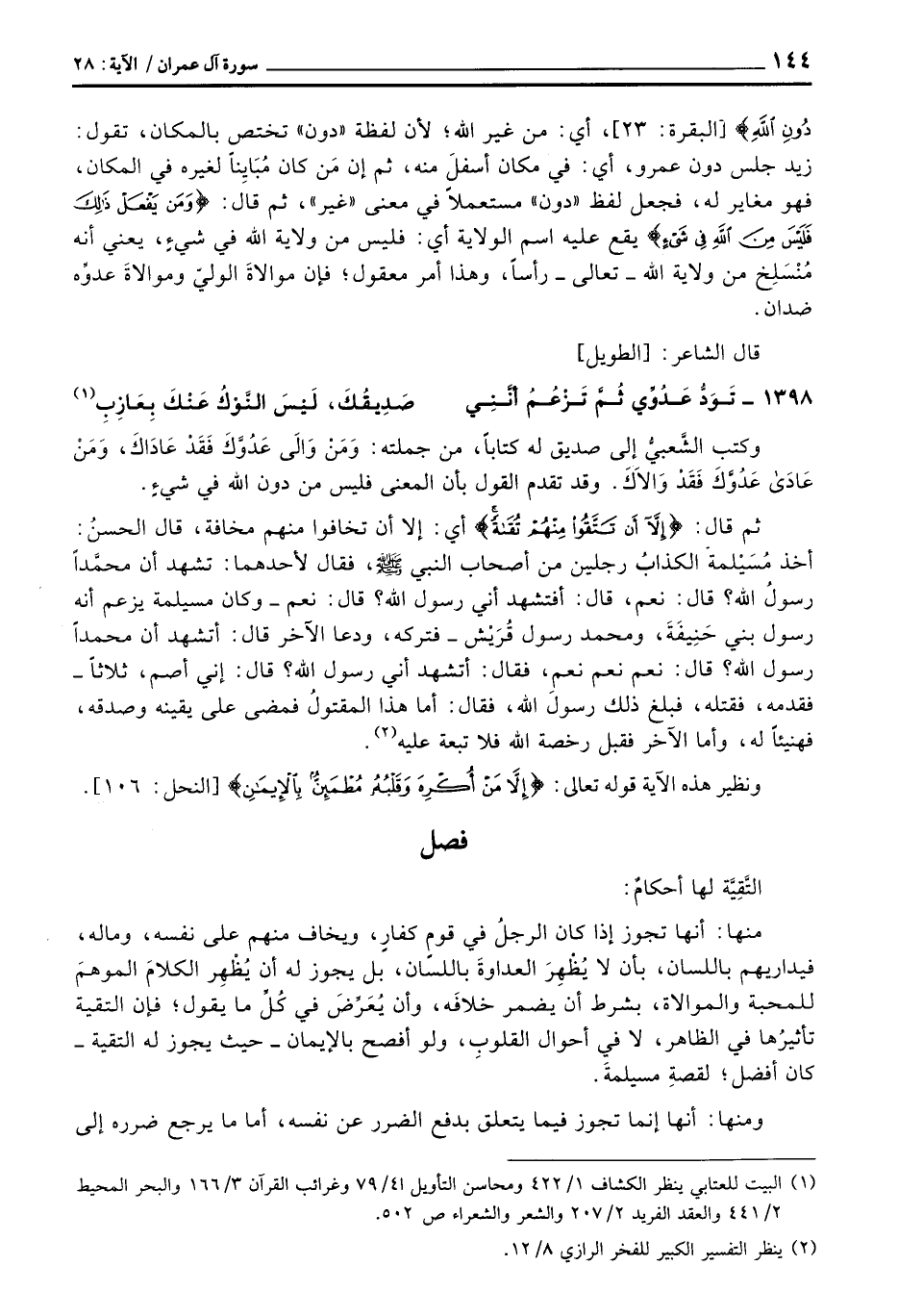دُونِ الله} [البقرة: 23] ، أي: من غير الله؛ لأن لفظة «دون» تختص بالمكان، تقول: زيد جلس دون عمرو، أي: في مكان أسفلَ منه، ثم إن مَن كان مُبَايِناً لغيره في المكان، فهو مغاير له، فجعل لفظ «دون» مستعملاً في معنى «غير» ، ثم قال: {وَمَن يَفْعَلْ ذلك فَلَيْسَ مِنَ الله فِي شَيْءٍ} يقع عليه اسم الولاية أي: فليس من ولاية الله في شيءٍ، يعني أنه مُنْسَلِخ من ولاية الله - تعالى - رأساً، وهذا أمر معقول؛ فإن موالاةَ الوليّ وموالاةَ عدوِّه ضدان.