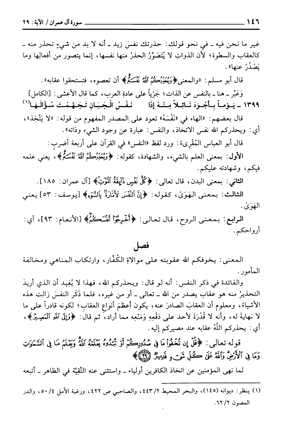 قال بعضهم: «الهاء في» نَفْسَهُ «تعود على المصدر المفهوم من قوله:» لاَ يَتَّخِذ «، أي: ويحذركم الله نفس الاتخاذ، والنفس: عبارة عن وجود الشيء وذاته» .