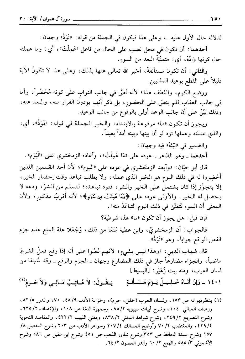 أحدهما: أن تكون في محل نصب على الحال من فاعل «عَمِلَتْ» ، أي: وما عملته حال كونها وَادَّةً، اي: متمنِّيًَ البعد من السوءِ.