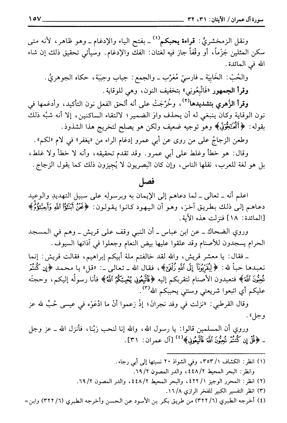 - فقال: يا معشر قريش، والله لقد خالفتم ملة أبيكم إبراهيم، فقالت قريش: إنما نعبدها حباً لله: {لِيُقَرِّبُونَآ إِلَى الله زلفى} [الزمر: 3] ، فقال الله - تعالى -: «قل» يا محمد {إِن كُنتُمْ تُحِبُّونَ الله} فتعبدون الأصنام لتقربكم إليه {فاتبعوني يُحْبِبْكُمُ الله} فأنا رسولُه إليكم، وحجتُه عليكم أي اتبعوا شريعتي وسنتي يحببكم الله.