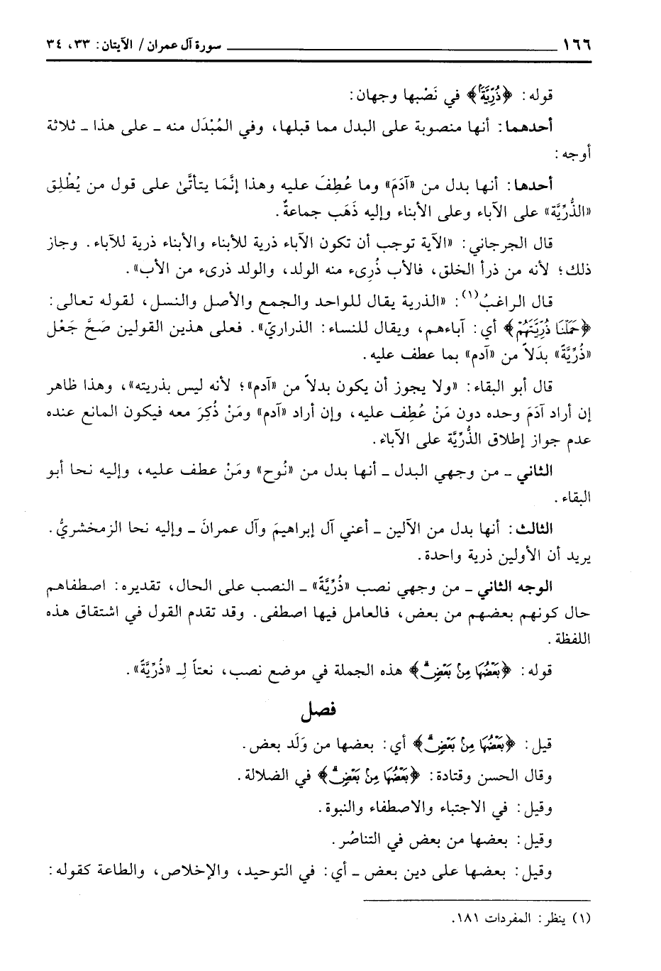 الوجه الثاني - من وجهي نصب «ذُرِّيَّةً» - النصب على الحال، تقديره: اصطفاهم حال كونهم بعضهم من بعض، فالعامل فيها اصطفى. وقد تقدم القول في اشتقاق هذه اللفظة.