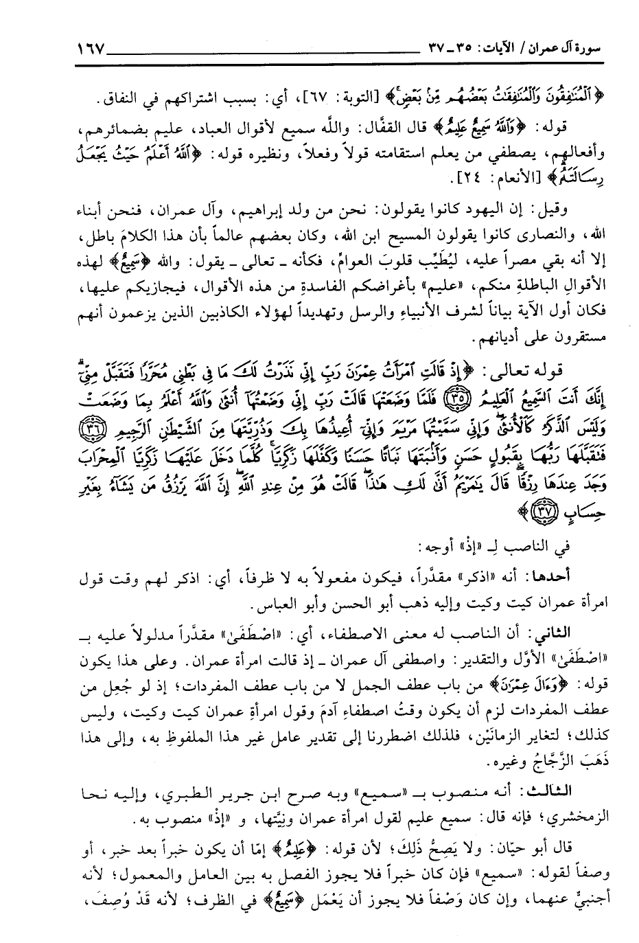 الثاني: أن الناصب له معنى الاصطفاء، أي: «اصْطَفَى» مقدَّراً مدلولاً عليه ب «اصْطَفَى» الأوَّل والتقدير: واصطفى آل عمران - إذ قالت امرأة عمران. وعلى هذا يكون قوله: {وَآلَ عِمْرَانَ} [آل عمران: 33] من باب عطف الجمل لا من باب عطف المفردات؛ إذ لو جُعِل من عطف المفردات لزم أن يكون وقتُ اصطفاءِ آدمَ وقول امرأةِ عمران كيت وكيت، وليس كذلك؛ لتغاير الزمانَيْن، فلذلك اضطررنا إلى تقدير عامل غير هذا الملفوظِ به، وإلى هذا ذَهَبَ الزَّجَّاجُ وغيره.