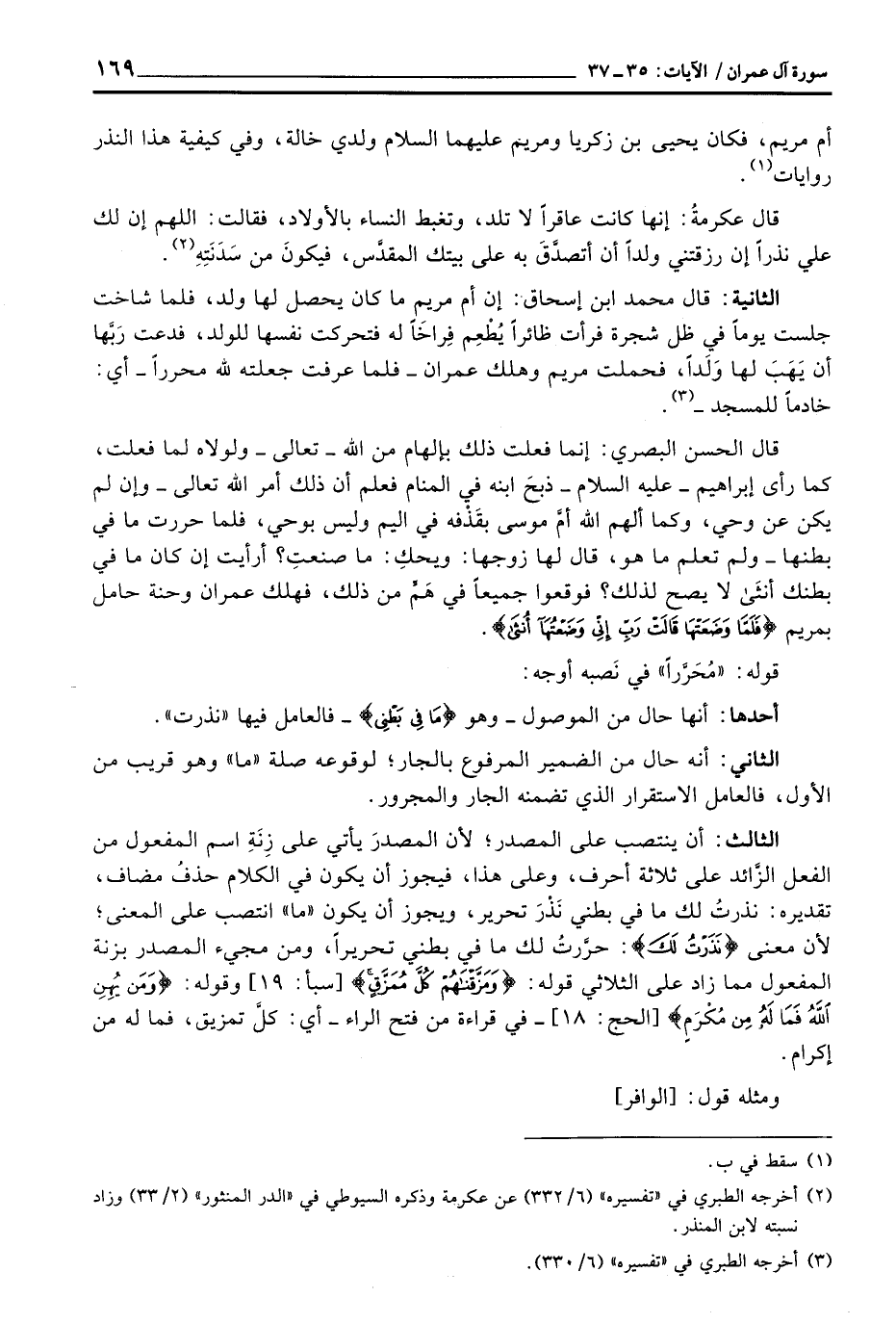 الثانية: قال محمد بن إسحاق: إن أم مريم ما كان يحصل لها ولد، فلما شاخت جلست يوماً في ظل شجرة فرأت ظائراً يُطْعِم فِراخًاً له فتحركت نفسها للولد، فدعت رَبَّها أن يَهَبَ لها وَلَداً، فحملت مريم وهلك عمران - فلما عرفت جعلته لله محرراً - أي: خادماً للمسجد.