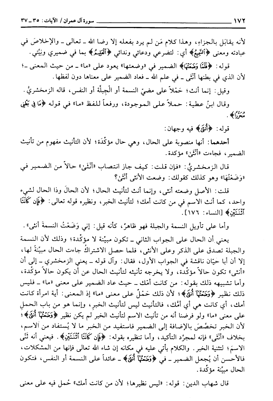 يعني أن الحال على الجواب الثاني - تكون مبيِّنة لا مؤكِّدة؛ وذلك لأن النسمة والجبلة تصدق على الذكر وعلى الأنثى، فلما حصل الاشتراكُ جاءت الحال مبيِّنةً لها، إلا أن أبا حيّان ناقشة في الجواب الأول، فقال: وآل قوله - يعني الزمخشري - إلى أن «أنثى» تكون حالاً مؤكِّدة، ولا يخرجه تأنيثه لتأنيث الحال عن أن يكون حالاً مؤكِّدة، وأما تشبيهه ذلك بقوله: من كانت أمّك - حيث عاد الضمير على معنى «ما» - فليس ذلك نظير {وَضَعْتُهَآ أنثى} ؛ لأن ذلك حَمْلٌ على معنى «ما» إذ المعنى: اية امرأة كانت أمك، أي كانت هي أي أمُّك، فالتأنيث ليس لتأنيث الخبرِ، وإنما هو من باب الحملِ على معنى «ما» ولو فرضنا أنه من تأنيث الاسم لتأنيث الخبر لم يكن نظير {وَضَعْتُهَآ أنثى} ؛ لأن الخبر تخصَّصَ بالإضافة غلى الضمير فاستفيد من الخبر ما لا يُستفاد من الاسم، بخلاف «أنْثَى» فإنه لمجرَّد التأكيد، وأما تنظيره بقوله: {فَإِن كَانَتَا اثنتين} . فيعني أنه ثَنَّى الاسمَ؛ لتثنية الخبر. والكلام يأتي عليه في مكانه إن شاء الله تعالى فإنها من المشكلات، فالأحسن أن يُجعل الضمير - في {وَضَعْتُهَآ أنثى} - عائداً على النسمة أو النفس، فتكون الحال مبيِّنة مؤكِّدة.